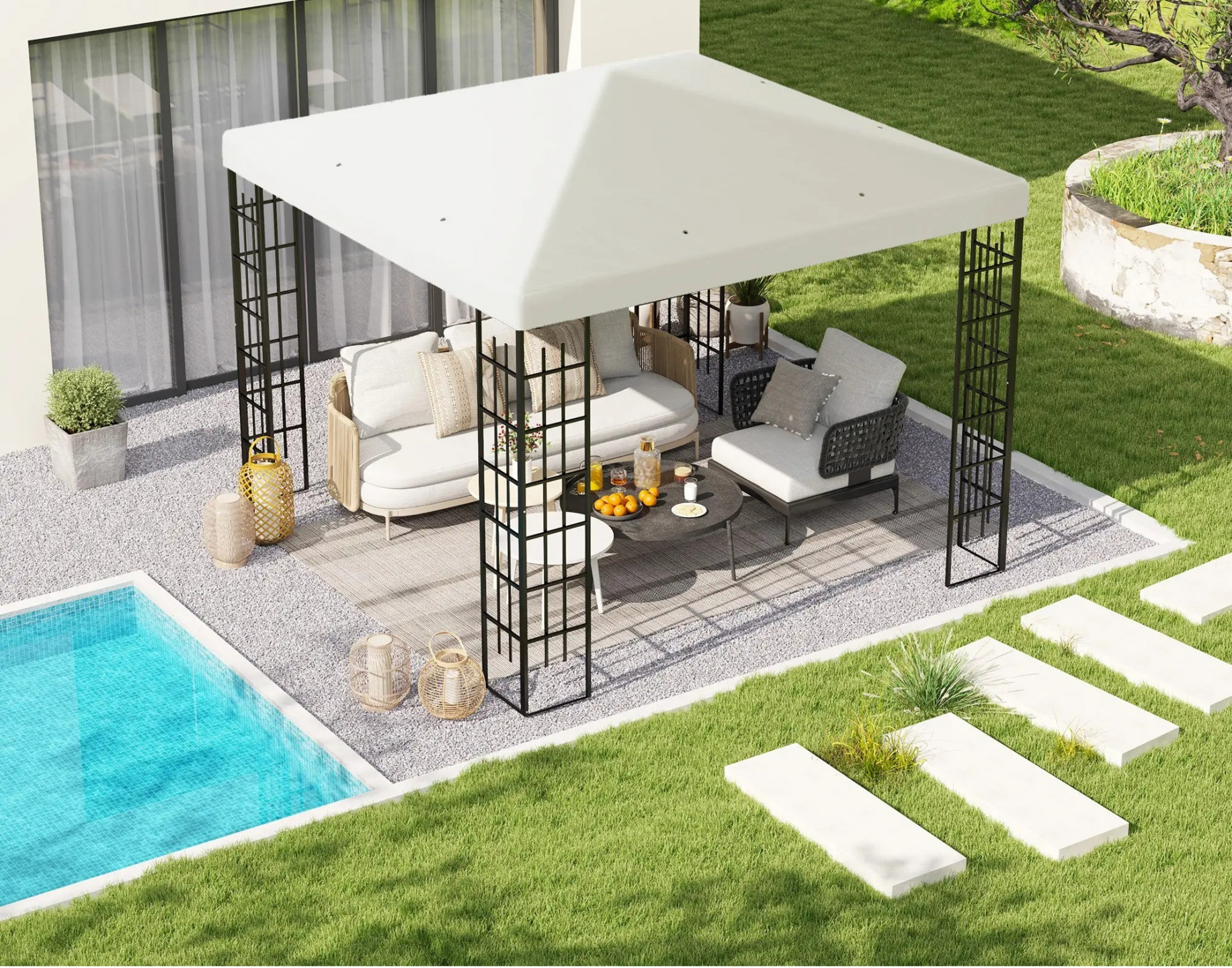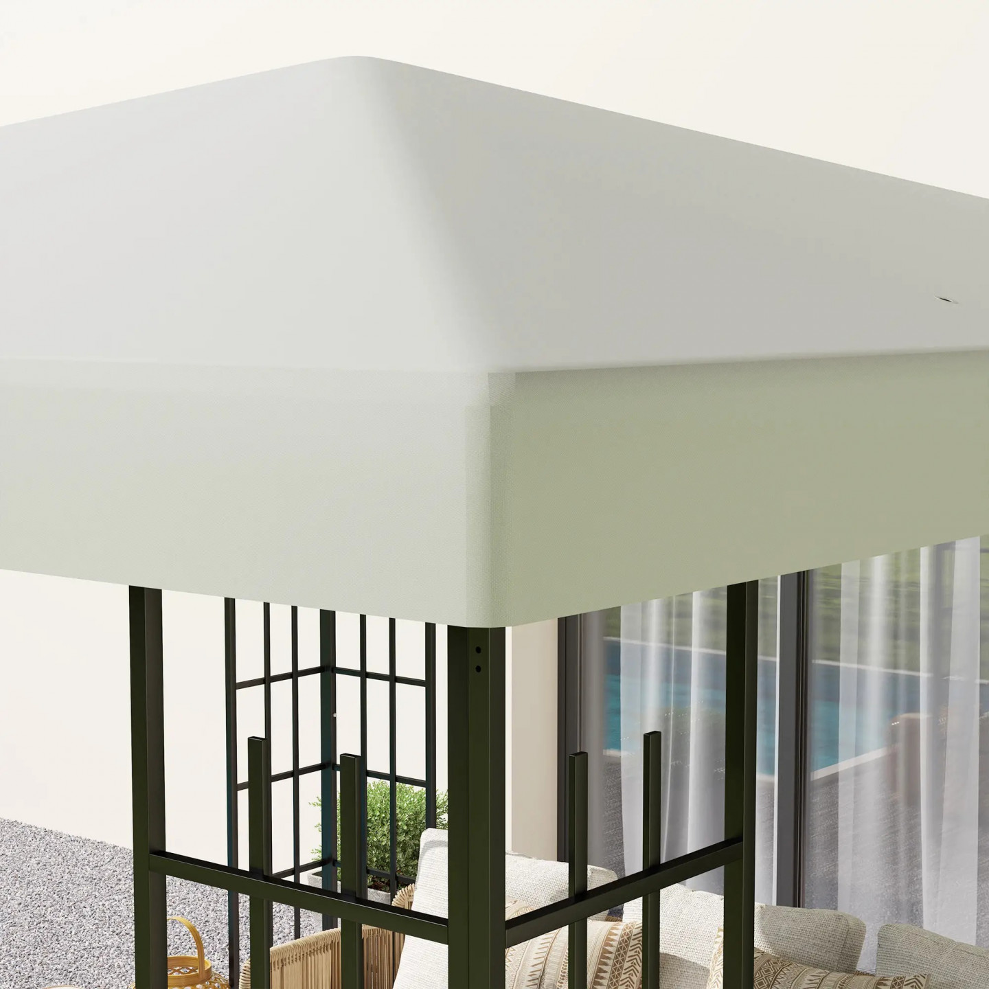 - Potažená polyesterová tkanina střechy altánu je silná a odolná, nabízí ochranu UPF30+.