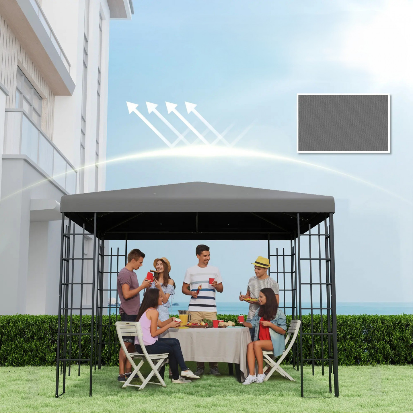- Potažená polyesterová tkanina střechy altánu je silná a odolná, nabízí ochranu UPF30+.