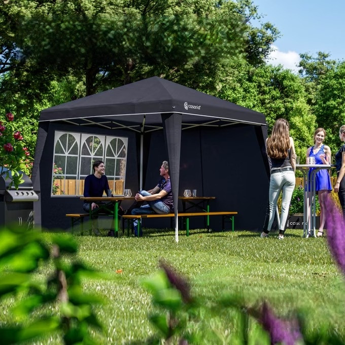 Praktické boční stěny se zipem a třídílným bočním okénkem lze rychle a snadno připevnit k vašemu altánu Capri. Jeden boční panel je vybaven zipem. Stěnu altánu můžete snadno zavřít dle potřeby nebo ji jednoduše připevnit pomocí upevňovacích popruhů.Suché zipy na bočních stěnách jsou připevněny k tyčím vašeho altánu.