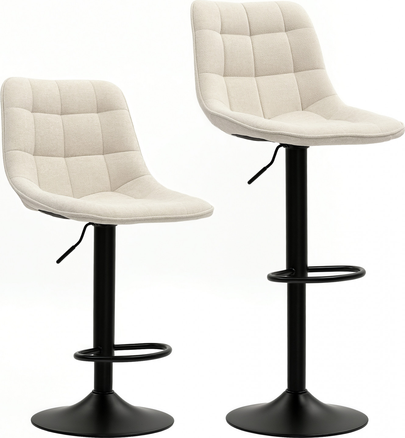 Užijte si prvotřídní pohodlí s našimi dvěma barovými židlemi s měkkým čalouněním pro pohodlné sezení. Barové stoličky jsou výškově nastavitelné a otočné o 360°. Jejich práškově lakovaná ocelová podnož s gumovým kroužkem zajišťuje stabilitu a ochranu podlahy. Jsou ideální pro kuchyňské ostrůvky nebo snídaňové bary a vnesou do vašeho prostoru moderní eleganci.