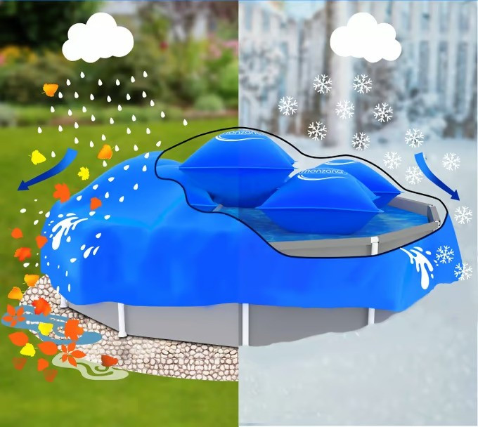 Odolné bazénové polštáře pomáhají udržovat váš zahradní bazén v dobrém stavu i přes zimu. Obrovské polštáře rozšiřují kryt ve sněhu, dešti a ledu, čímž zabraňují tvorbě kaluží, když je váš bazén v chladném období zakrytý. S polštáři pod ním se kryt bazénu nemůže propadnout a sníh, led a nečistoty se nemohou dostat do bazénové vody. Díky integrovanému pojistnému ventilu lze polštáře nafouknout jakýmkoli typem ruční nebo elektrické pumpy . Vysoce kvalitní očka v rozích bazénového polštáře umožňují spojit více polštářů dohromady a vytvořit tak stabilní a povětrnostním vlivům odolný celek .PVC materiál s tloušťkou 0,44 mm je dvakrát silnější než běžné zimní polštáře . Odolává všem povětrnostním podmínkám, včetně slané a chlorované vody. Jemně pórovitý povrch zajišťuje dobrou odolnost vůči chladu až do -20 °C. Dvojitě prošité okraje jsou robustní a dále zvyšují odolnost, takže polštáře můžete používat po dlouhou dobu .Šestimetrové lano můžete zkrátit na libovolnou délku a připevnit bazénovou podložku k vašemu bazénu nebo bazénu. Součástí je i sada na opravu .