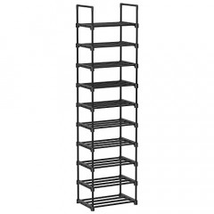 Vďaka svojej úzkej šírke zaberá tento 10-poschodový stojan na topánky málo miesta na podlahe, ale ponúka dostatok úložného priestoru pre 20 párov topánok. Ak chcete uložiť vysoké topánky alebo úložné boxy, jednoducho odstráňte jednu policu z kovového regálu a vytvoríte si dostatok priestoru. Môžete ho tiež rozdeliť na 2 malé a používať ich samostatne v rôznych miestnostiach - všetko závisí od vašich potrieb