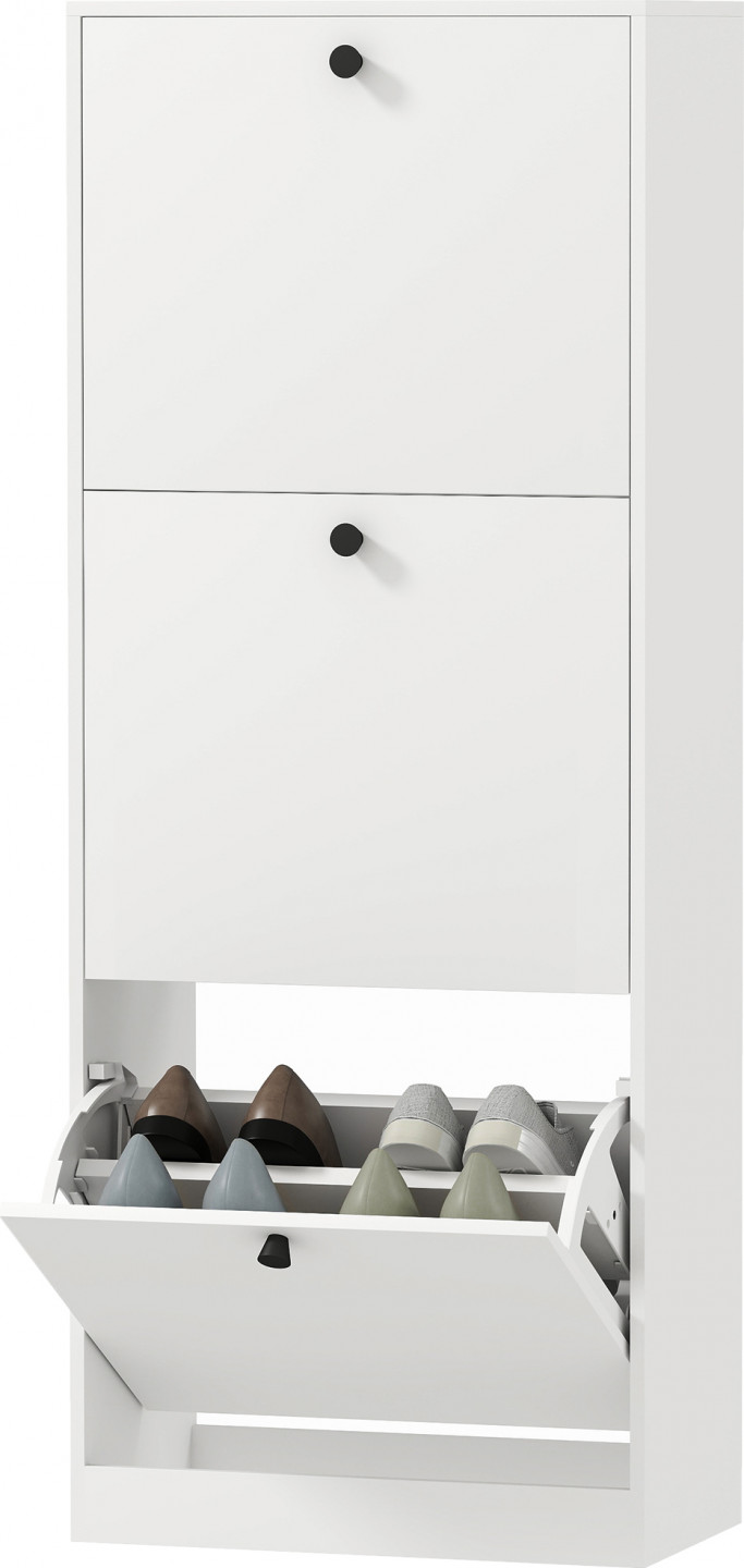 Uložte své boty stylově a přehledně do botníku. Elegantní design botníku s černými kulatými úchyty a třemi přihrádkami nabízí prostor až pro 12 párů bot. Je ideální do stísněných prostor a díky nastavitelným policím si ji můžete snadno přizpůsobit. Ideální volba pro elegantní domov!