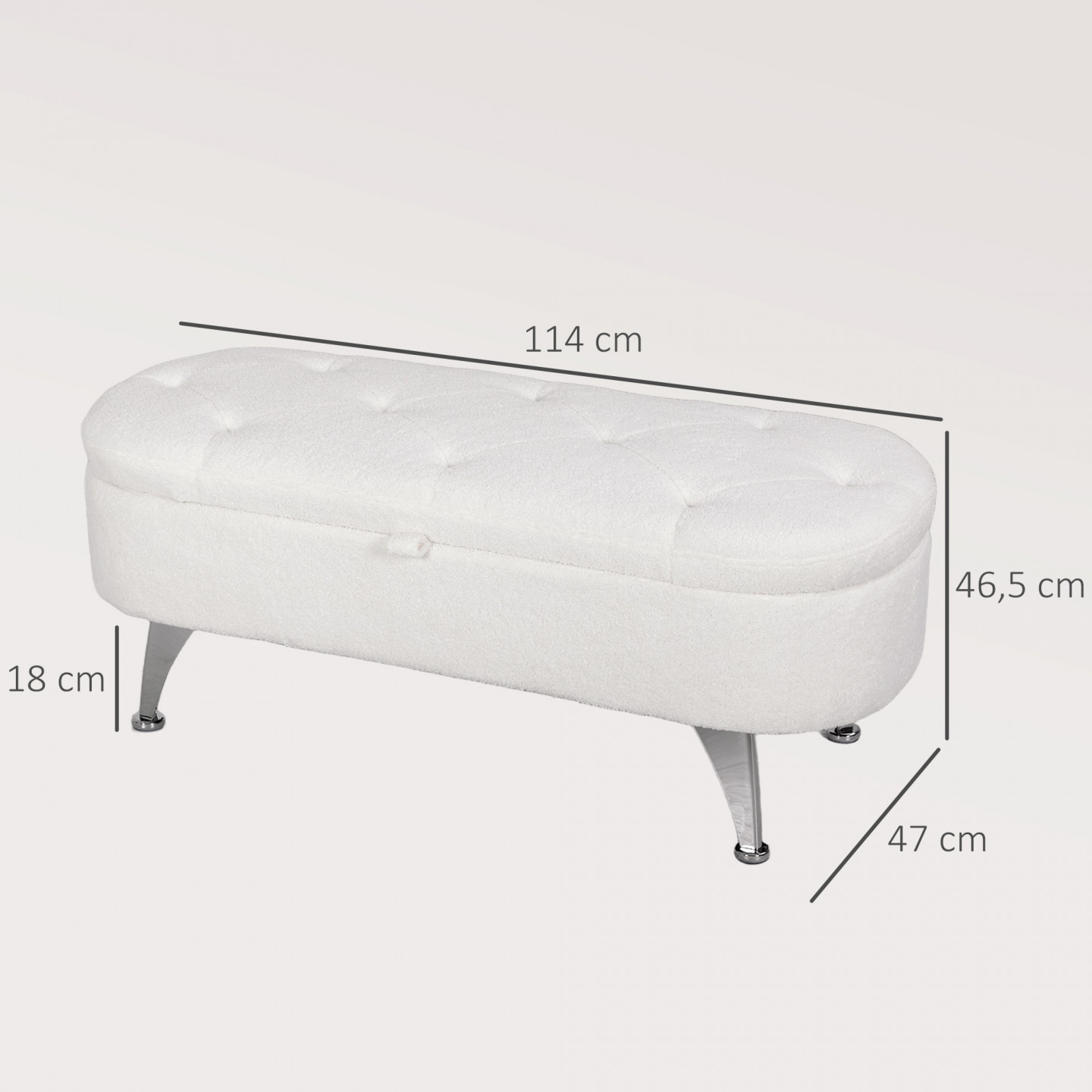 Poznejte kouzlo lavice s úložným prostorem. Deky, polštáře a další předměty můžete bezpečně a mimo dohled uložit pod odklopné víko. Pohodlné sezení zajišťuje měkký látkový potah a kosočtvercový vzorovaný čalouněný povrch lavice. Tento oválný šperk s kovovými nohami, který je ideální jako lavice do předsíně nebo k posteli i jako podnožka, dodá útulný a všestranný vzhled každé místnosti.