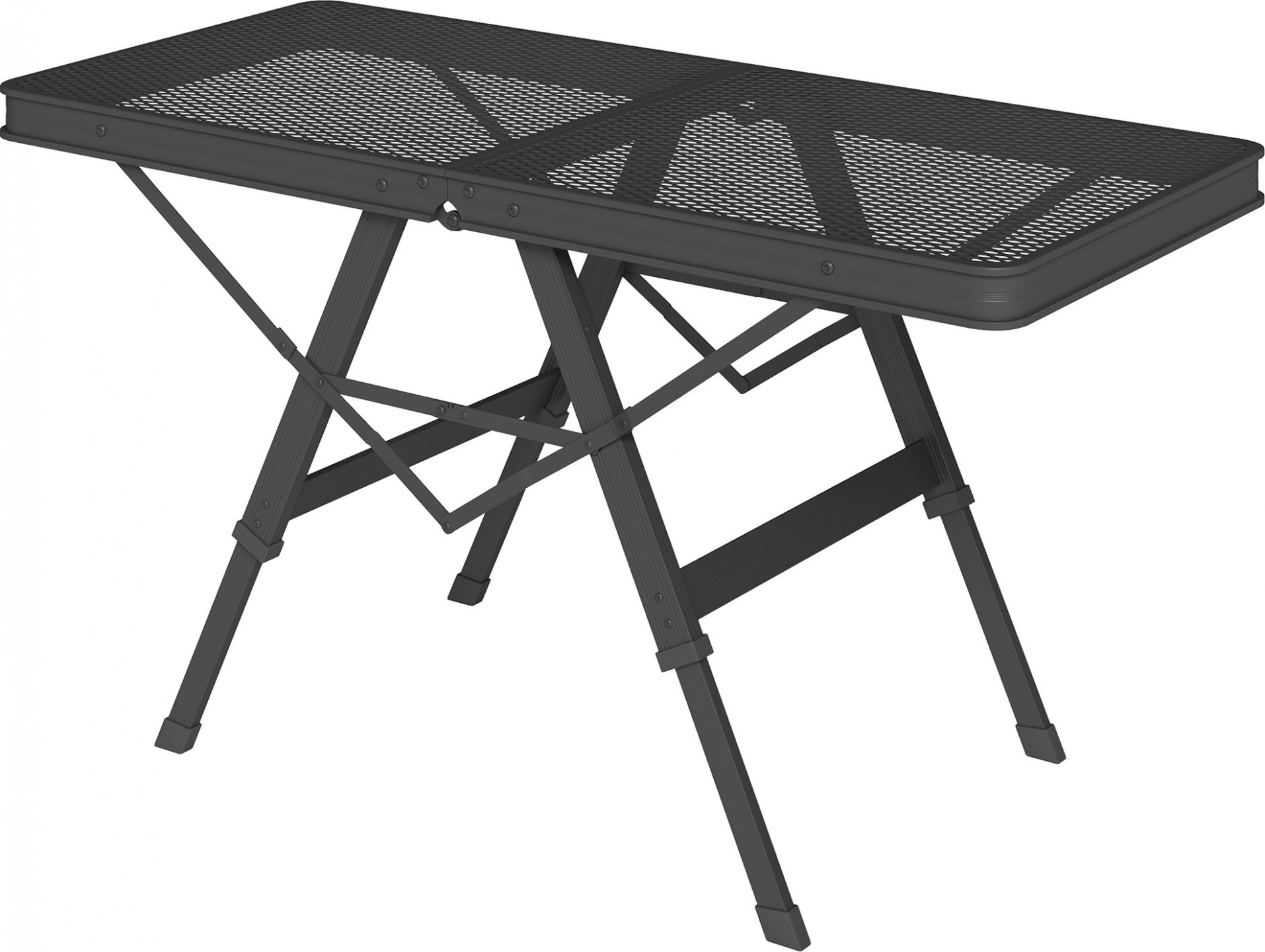 Vyzkoušejte flexibilitu přenosného skládacího kempingového stolu s jedinečnou kovovou deskou ze síťoviny odolnou proti rzi a vodě. Díky dvojímu nastavení výšky (48 cm a 58 cm) je skládací zahradní stůl ideální na pikniky, grilování nebo jako zahradní stůl. Snadno se postaví v interiéru i exteriéru a stejně snadno se skladuje.