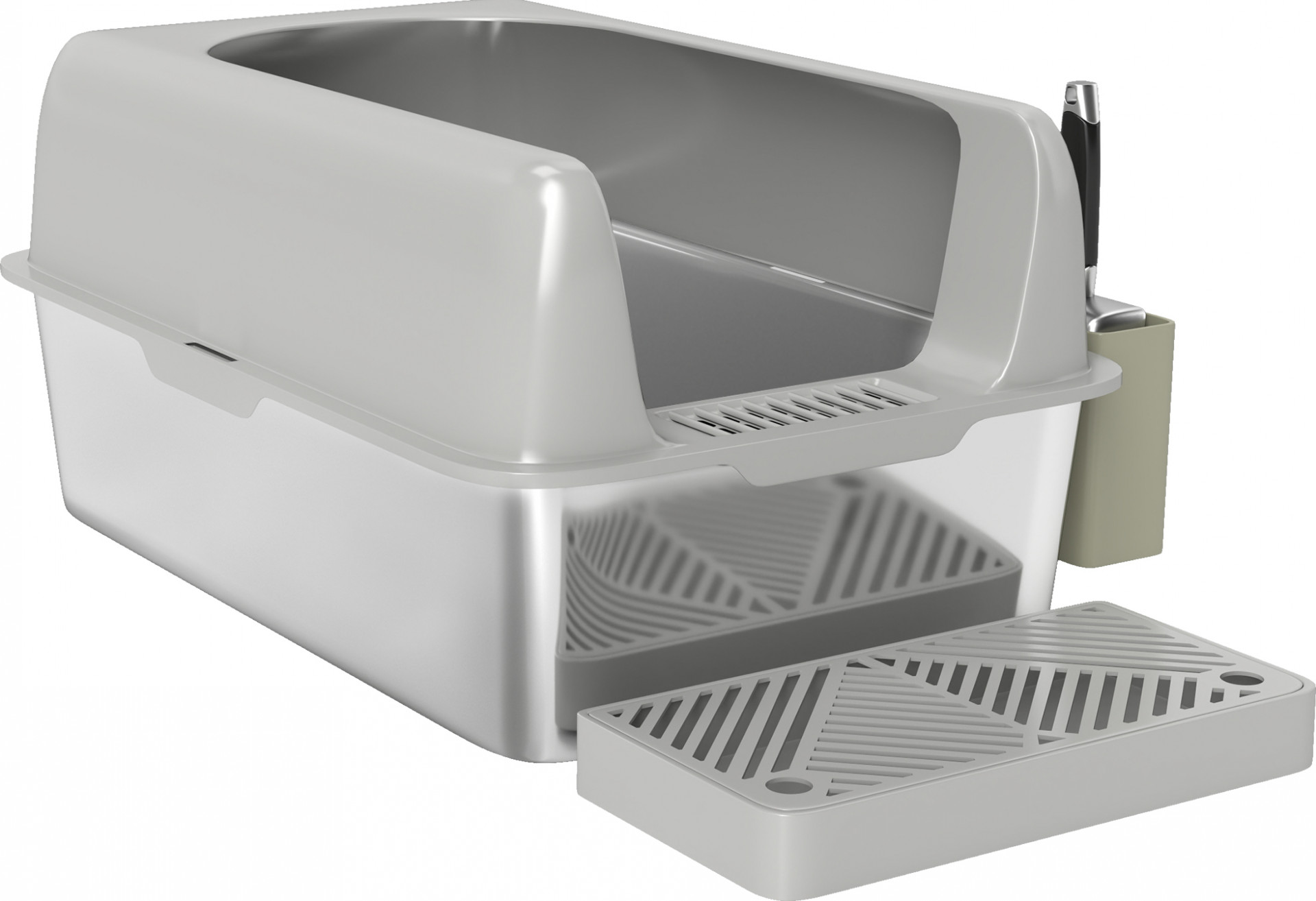 Vyzkoušejte stylový nerezový zásobník na stelivo, který je dokonalou kombinací funkčnosti a designu! S 13,8 cm vysokými bočními stěnami, které zabraňují pronikání nečistot, a robustní nerezovou miskou, díky níž je čištění hračka. Inovativní dvoukolejnicový systém písku minimalizuje písečné otisky tlapek. Součástí je praktická lopatka a úložný box.