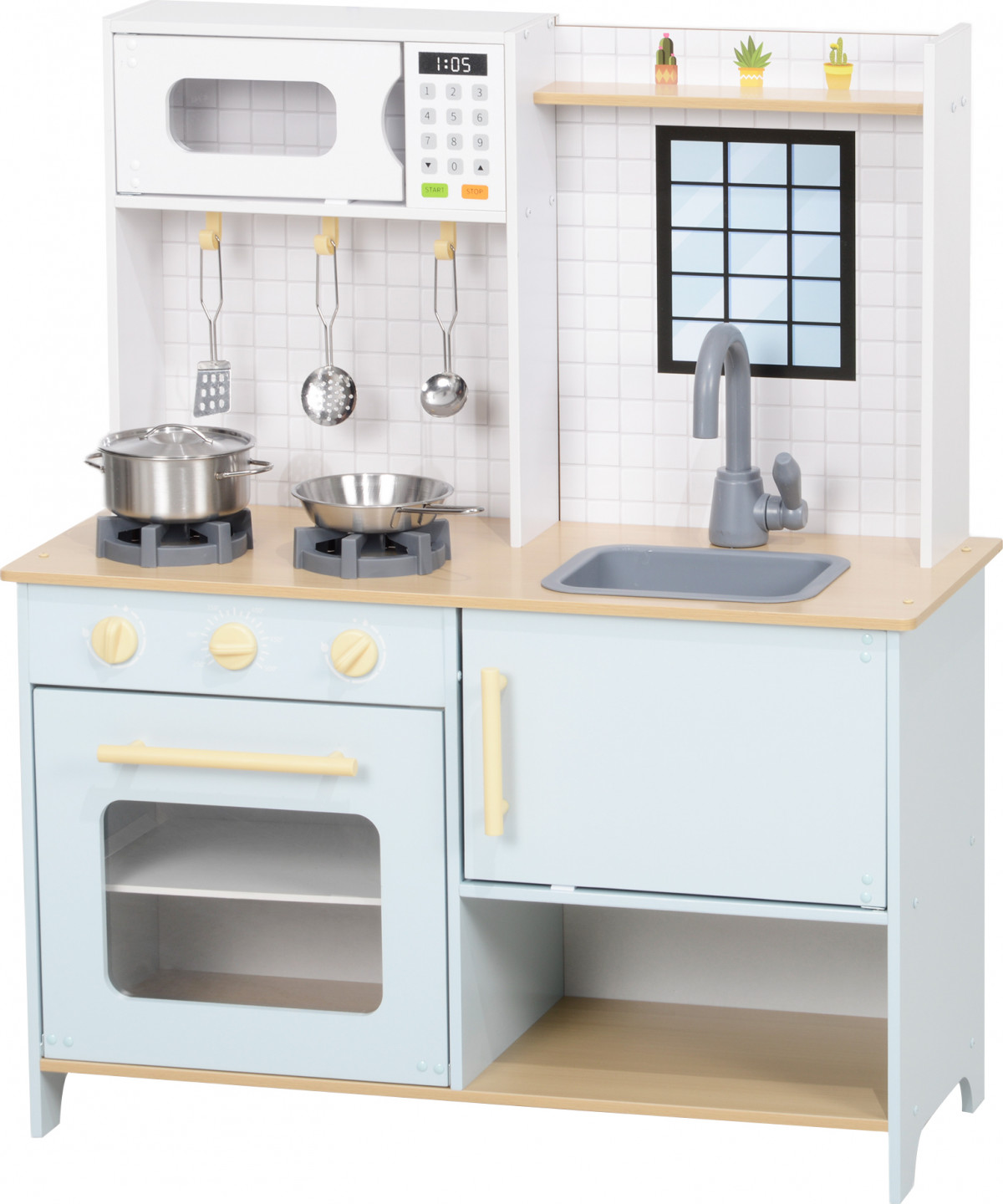 Vaše dítě objeví svůj kuchařský talent s hrací kuchyňkou! Tato kuchyňská sada, vybavená varnou deskou, mikrovlnnou troubou a troubou s otočnými knoflíky, podporuje aktivní hru. Součástí kuchyňky na hraní je pětidílná sada na vaření z nerezové oceli a praktická úložná řešení pro udržení pořádku v kuchyňce. Funkční kohoutek a dřez navíc děti hravou formou učí, jak umývat nádobí. Vhodné pro děti od tří let.