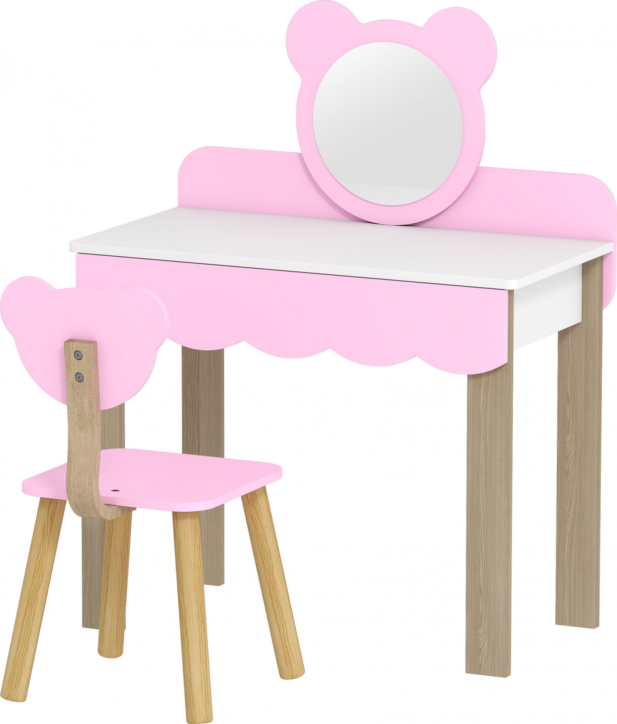 Dětský toaletní stolek se stane kouzelným místem v srdci dětského pokoje. Tato dětská toaletní souprava vyrobená z odolné MDF desky třídy E1 a se zaoblenými rohy nabízí bezpečné možnosti pro přípravu nebo pro kreativní hru. Prostorná zásuvka dětského kosmetického stolku podporuje organizaci a vnáší do každodenního života strukturu, zatímco design medvídka v kosmetickém zrcadle představuje roztomilý, hravý akcent v dětském pokoji.