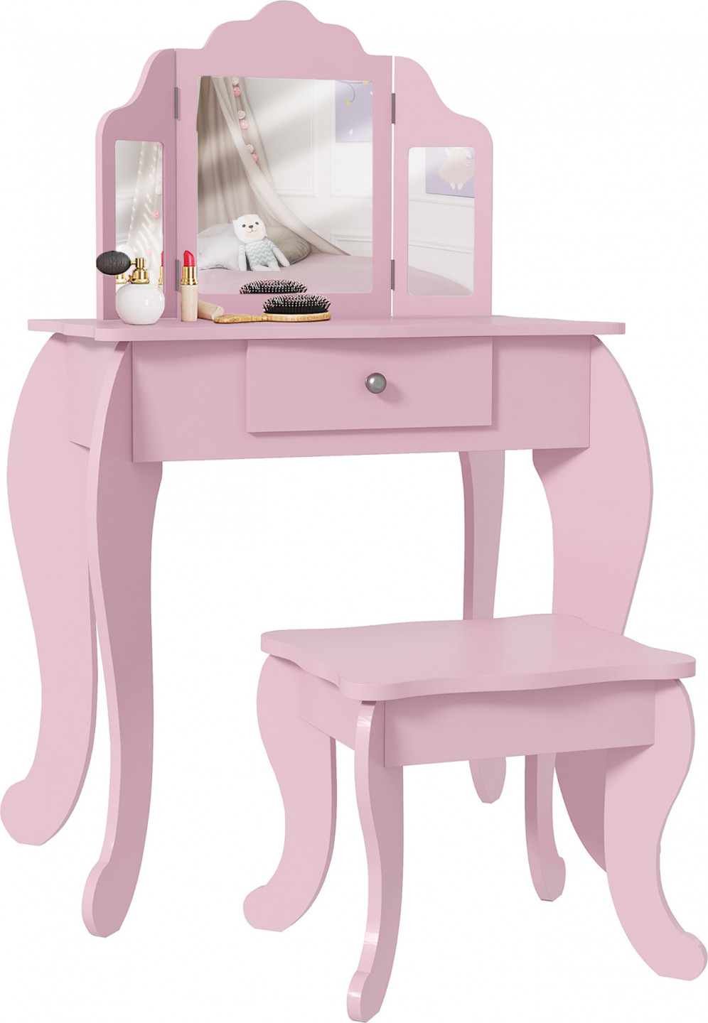 Hledáte krásný a funkční dětský toaletní stolek? Tento růžový toaletní stolek je ideální pro ty nejmenší, kteří chtějí napodobit dospělé. Díky bezpečné konstrukci z MDF, zaobleným hranám a trojitému zrcadlu s reflexním pokoveným sklem je ideální pro hru s make-upem nebo úpravu vlasů. Díky odpovídajícímu stolku a integrované zásuvce je vše přehledně uspořádáno a snadno dostupné. Je určena pro děti ve věku od 3 do 6 let a představuje robustní, hezký a velmi praktický kus nábytku.