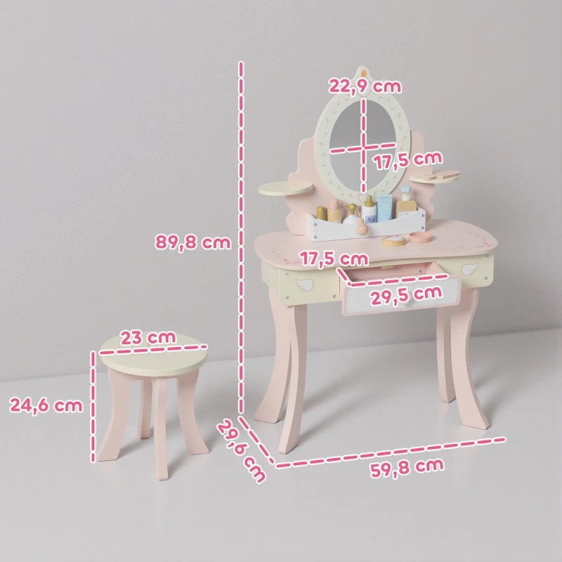 Tento dětský toaletní stolek je perfektním doplňkem do dětského pokoje pro malé parádnice i parádníky. Součástí sady je pohodlná židle, praktická zásuvka na drobnosti a odnímatelné zrcadlo, které usnadňuje údržbu a přizpůsobení podle potřeby. Stolek je vyroben z kvalitních materiálů s bezpečnými zaoblenými hranami a stabilní konstrukcí, která zaručuje bezpečnost při hraní. Ideální místo pro první pokusy s líčením, hraní na kosmetiku nebo ukládání pokladů.