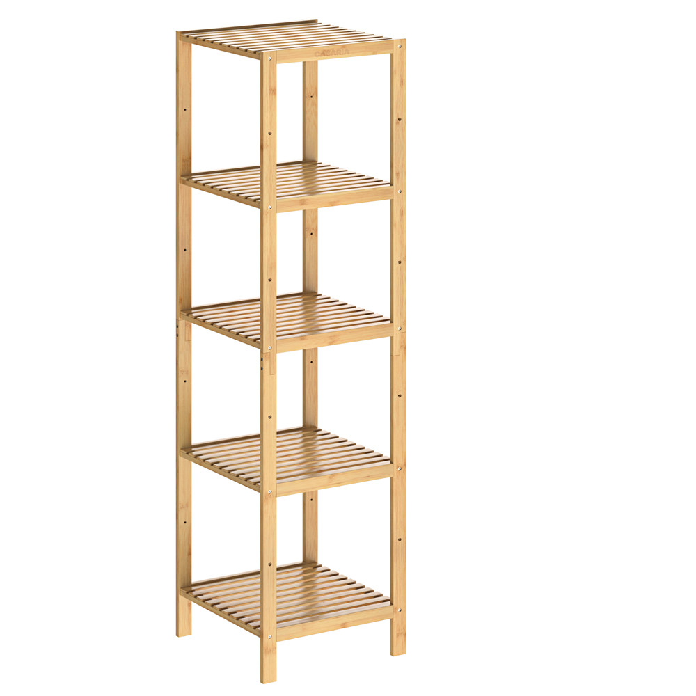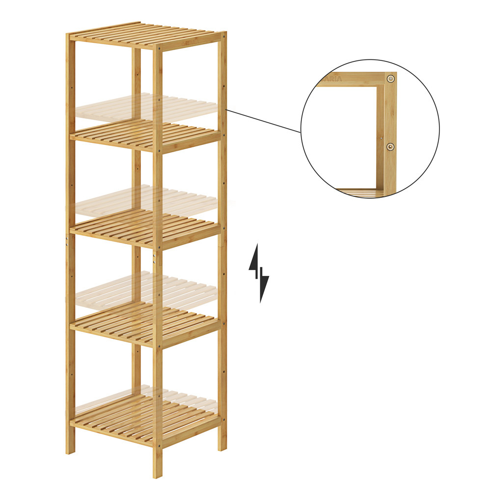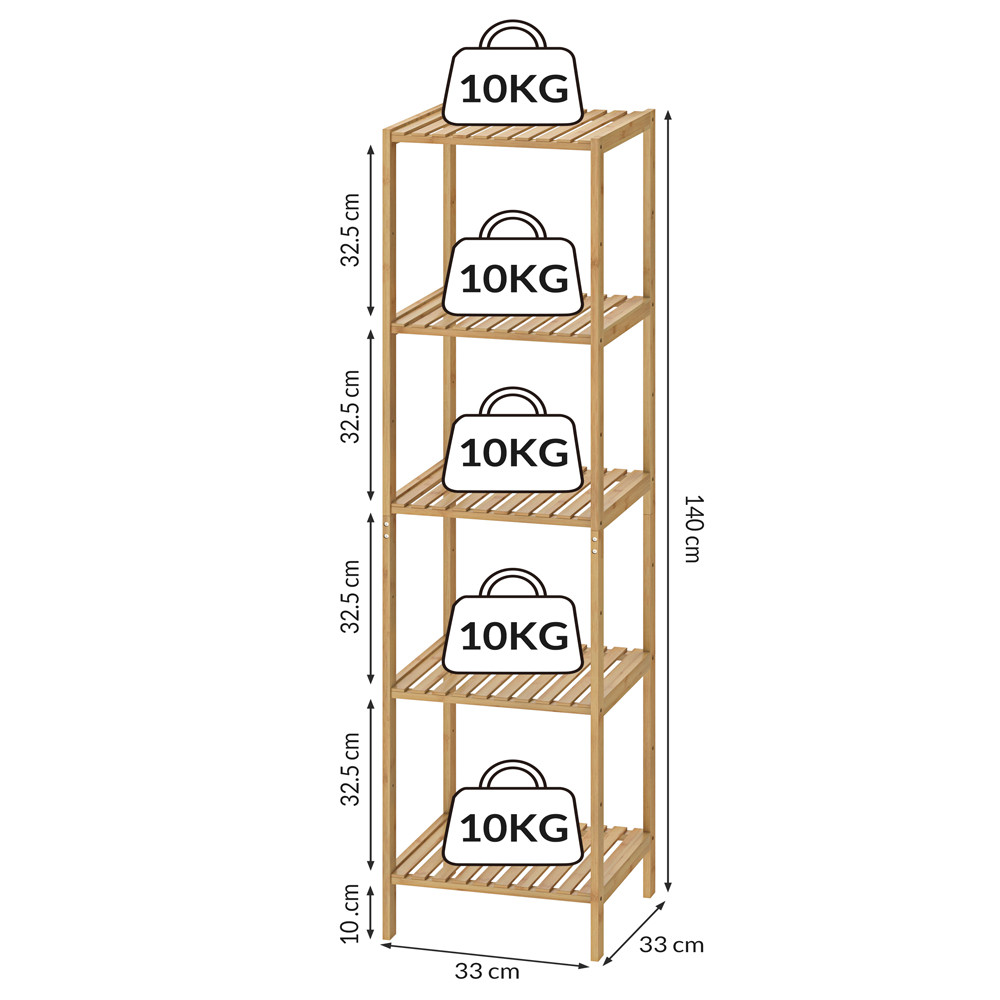 Táto 5-poschodová bambusová polička spája štýl a funkčnosť. Je to ideálna multifunkčná polica na vystavenie uterákov, kozmetiky, ale aj kvetov. Je vhodná do všetkých priestorov, ako sú obývacie izby, kuchyne, kúpeľne a chodby.