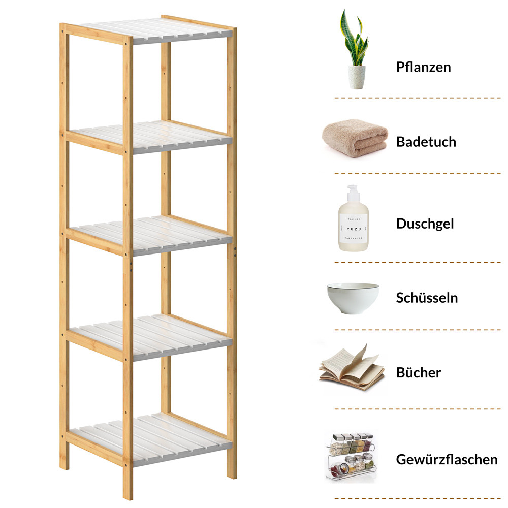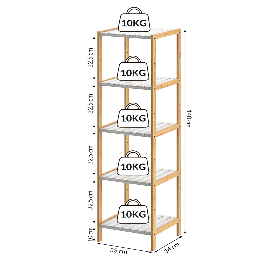 Táto 5-poschodová bambusová polička spája štýl a funkčnosť. Je to ideálna multifunkčná polica na vystavenie uterákov, kozmetiky, ale aj kvetov. Je vhodná do všetkých priestorov, ako sú obývacie izby, kuchyne, kúpeľne a chodby.