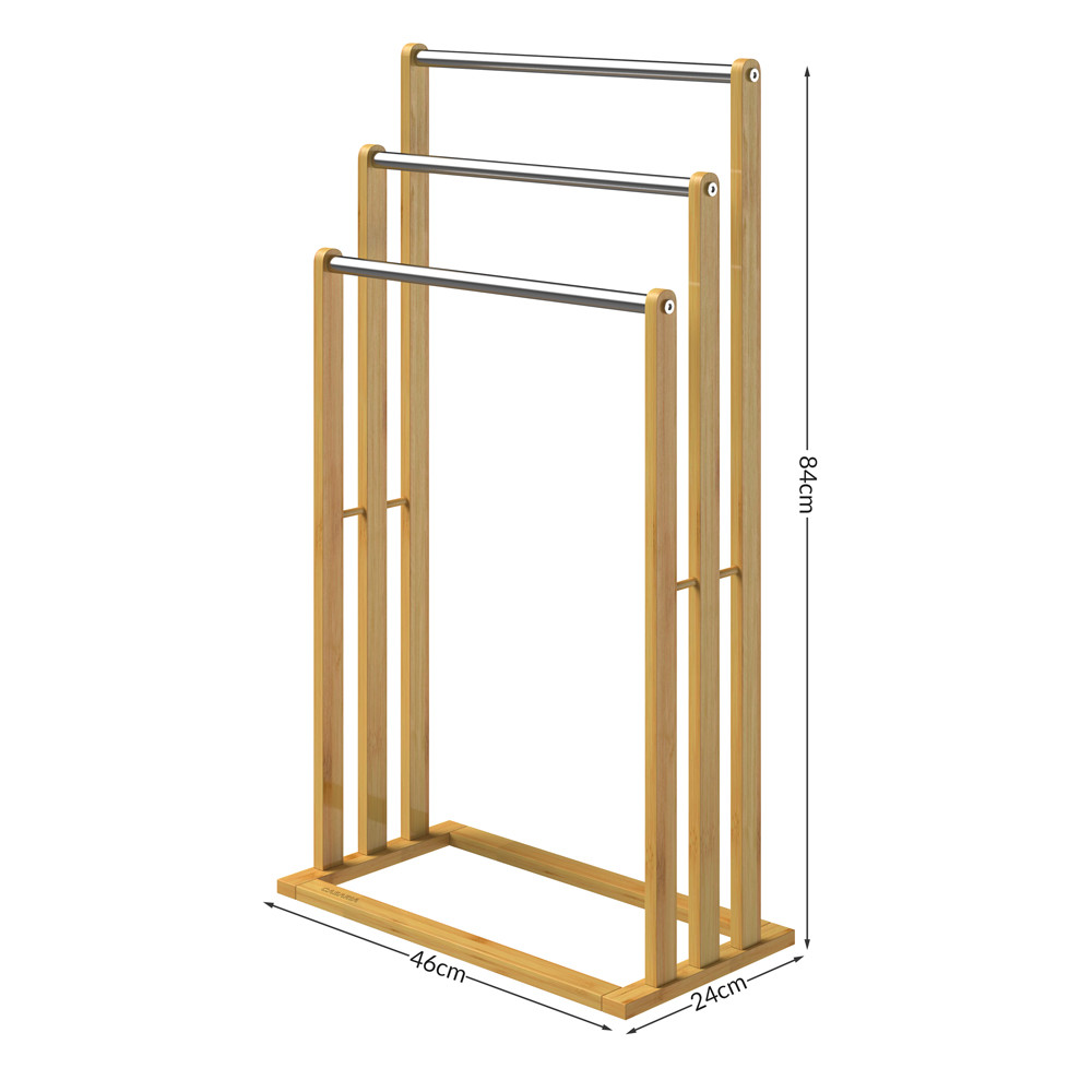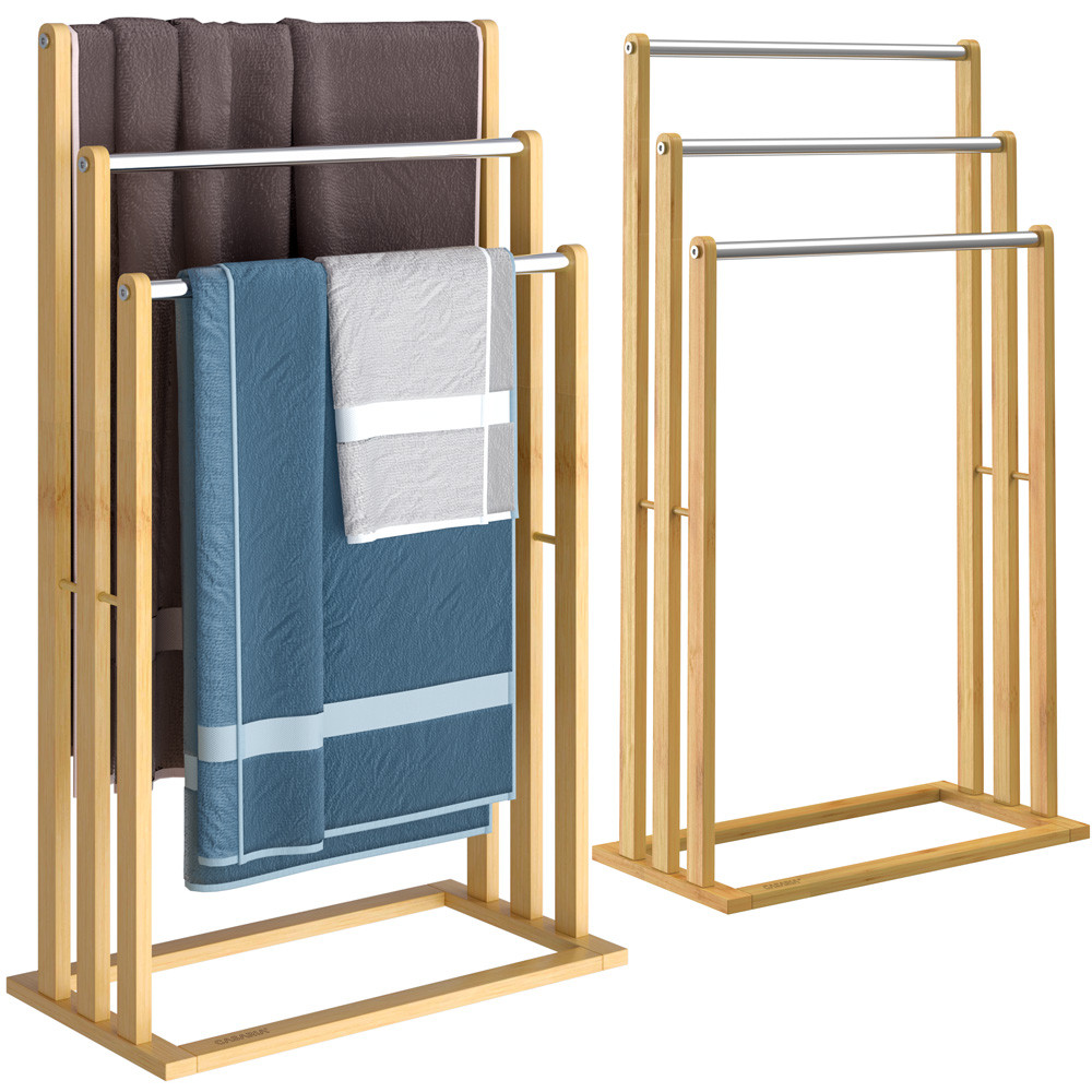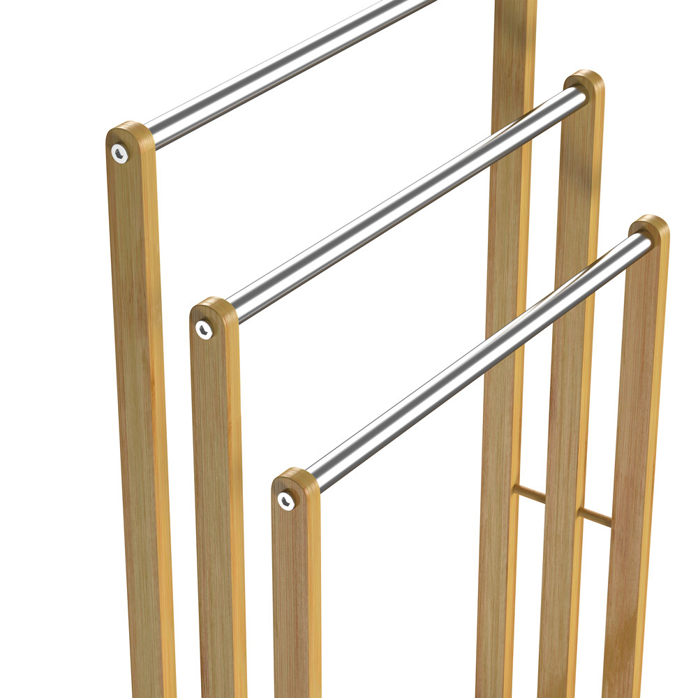 Držiak na uteráky z bambusu a nehrdzavejúcej ocele bude vkusným a praktickým doplnkom každej kúpeľne. Stojan v prírodnom dekore využijete najmä v kúpeľni na odkladanie uterákov alebo iných drobností, ale skvele poslúži aj ako doplnok do spálne, šatne alebo detskej izby na odkladanie oblečenia.