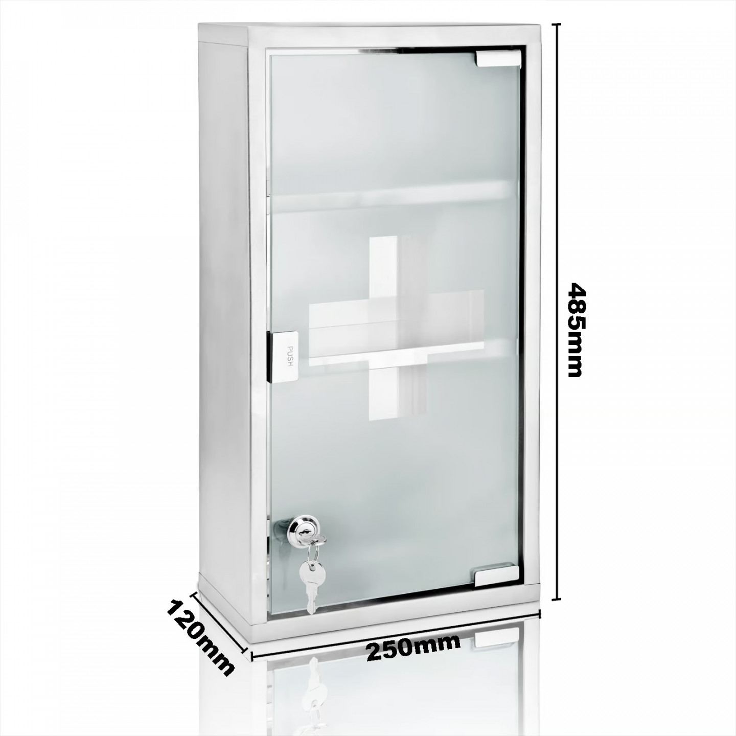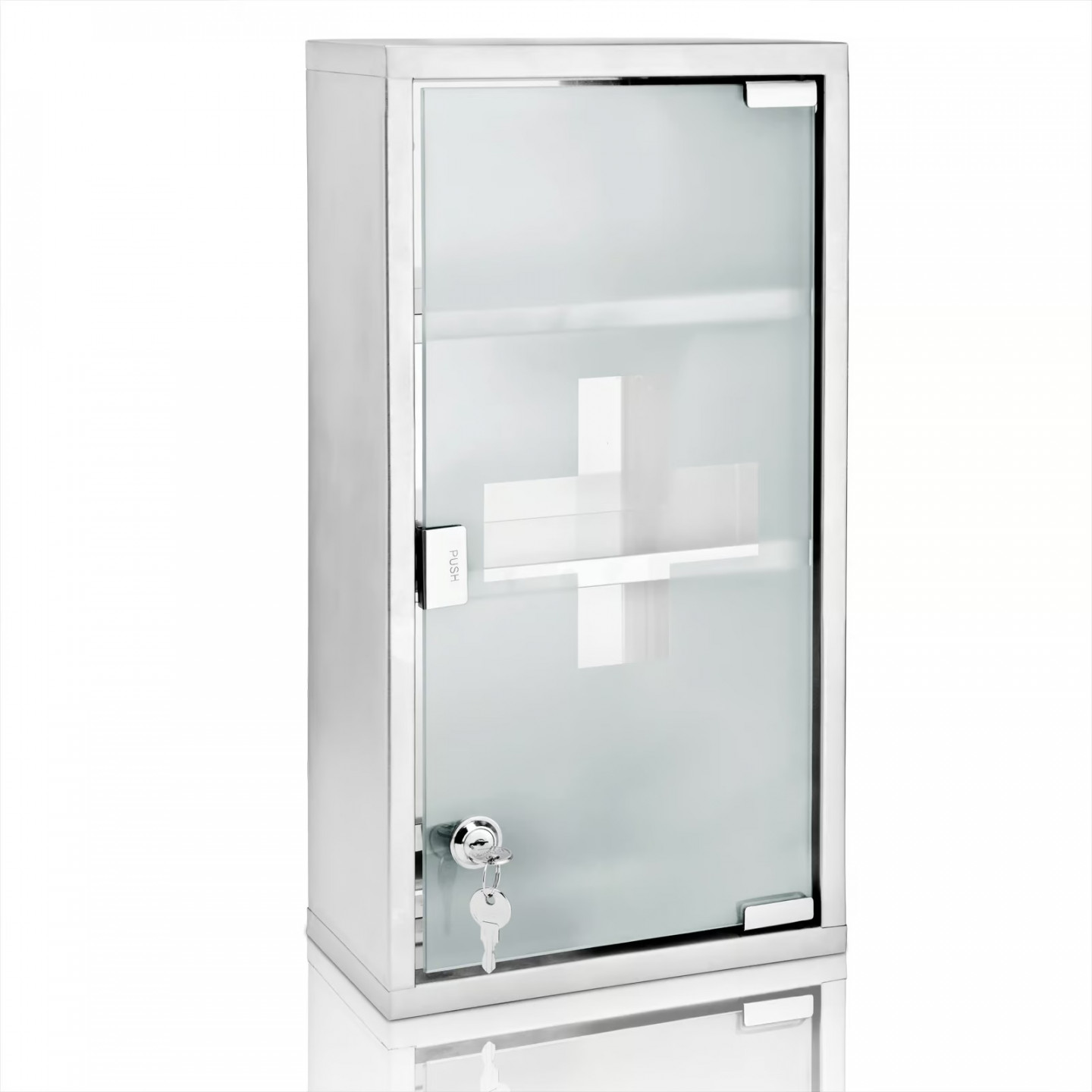 Tato praktická lékárnička z nerezové oceli nabízí díky svým prostorným přihrádkám dostatek prostoru pro vaše léky. Dvířka z matného bezpečnostního skla se snadno otevírají a zavírají díky magnetickému uzávěru citlivému na tlak. Pro zajištění bezpečného uložení léků je lékárnička opatřena válcovým zámkem a dvěma klíči. Skříňku lze rychle a snadno namontovat na zeď pomocí přiložených šroubů a hmoždinek.