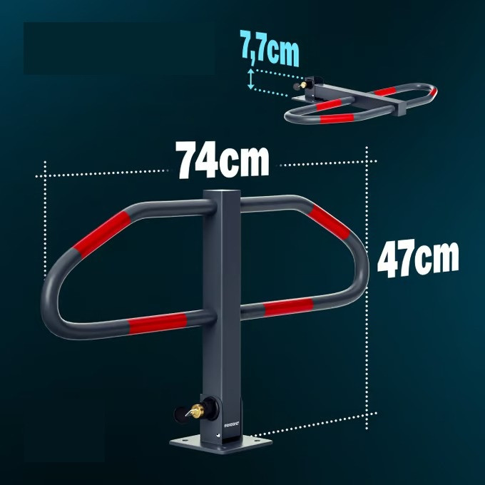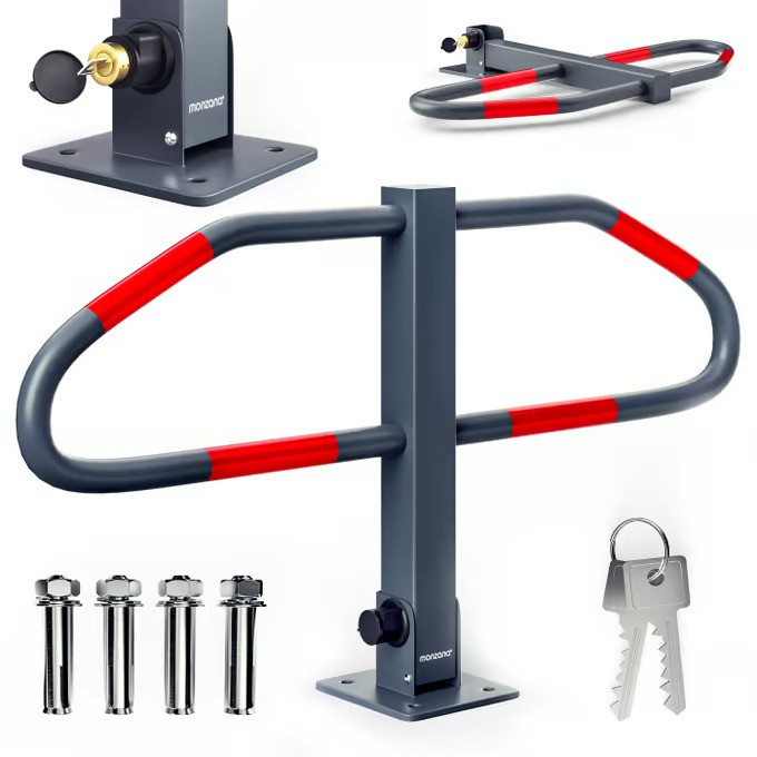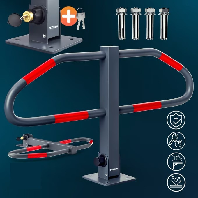 Skládací parkovací zábrana z robustní oceli s práškovým nástřikem drží nežádoucí nelegální parkující mimo vaše soukromé parkovací místo. Díky červeným reflexním pruhům je sloupek závory snadno viditelný i ve tmě. Integrovaný zámek se dvěma klíči zabraňuje neoprávněným parkujícím v jednoduchém převrácení závory. Máte plnou kontrolu nad tím, kdo na vašem parkovacím místě parkuje a kdo ne. Ocelová konstrukce o hmotnosti 4,6 kg se snadno přišroubuje do země pomocí přiloženého montážního materiálu a poté se postaví.