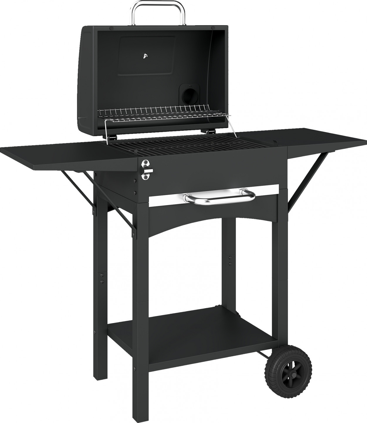 - Postranní stolky a spodní polička na grilu na dřevěné uhlí udržují veškeré grilovací náčiní přehledně uspořádané