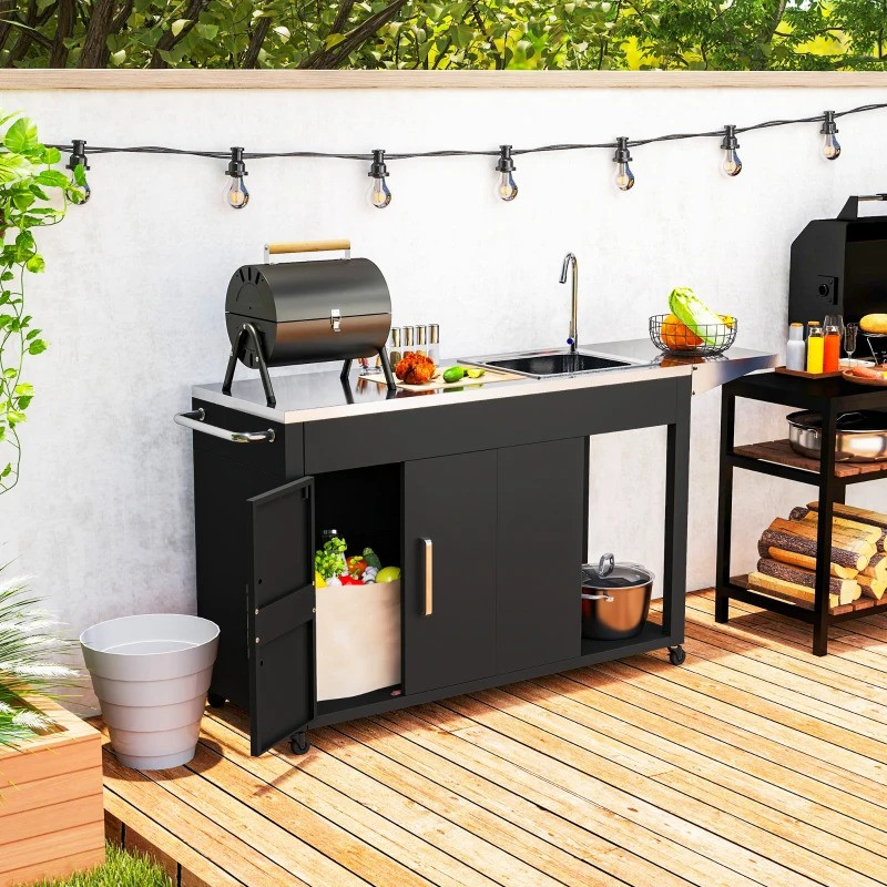 Zlepšete si zážitek z grilování s nerezovým grilovacím vozíkem, který je vybaven oplachovací stanicí pro venkovní přípravu pokrmů. Tento multifunkční grilovací vozík nabízí sklopnou boční polici pro více místa a skříňku s dvířky pro nepromokavé předměty. Díky praktickým kolečkům se servírovací vozík snadno přemisťuje a je ideální pro váš venkovní gril nebo pec na pizzu.