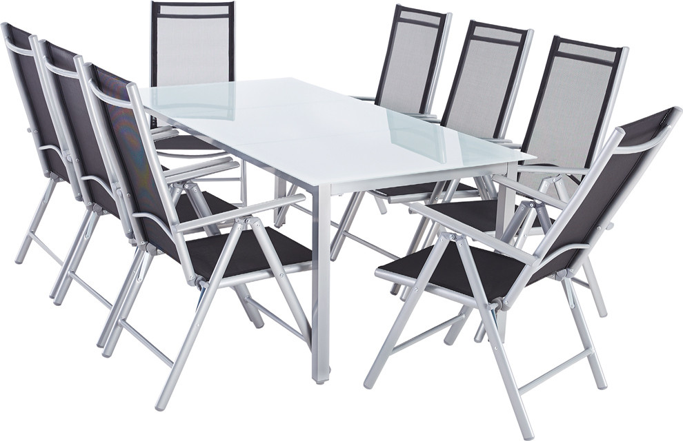 Proměňte svou zahradu nebo terasu v elegantní venkovní jídelní kout. S touto vysoce kvalitní zahradní sedací soupravou pro 8 osob , vyrobenou z robustního hliníku a se stylovou deskou z bezpečnostního skla, si vytvoříte ideální místo pro posezení venku. Moderní zahradní sedací souprava „Bern“ v antracitové barvě nabízí pohodlí, funkčnost a odolnost v atraktivním designu, který dokonale ladí s vaším stylem. Tato 9dílná zahradní jídelní sada se skládá z prostorného jídelního stolu s deskou z vysoce pevného bezpečnostního skla a 8 skládacích židlí s vysokým opěradlem . Opěradla zahradních židlí lze nastavit do 8 různých poloh , což vám umožní přizpůsobit si pohodlí sezení – ideální pro stolování, relaxaci nebo prostě jen pro trávení času venku. Díky extrémně odolným materiálům je tato jídelní sada ideální pro celoroční venkovní i vnitřní použití , aniž by musela obětovat styl. Ať už svítí slunečno, prší nebo sněží, vaše sedací souprava Bern zvládne všechno!Tato vysoce kvalitní zahradní sedací souprava je perfektním společníkem pro útulné grilování, přátelské rodinné večeře nebo pohodová odpoledne venku. A díky své vhodnosti do interiéru je také skvělou jídelní sadou do vaší zimní zahrady nebo společenské místnosti! Dopřejte si tuto stylovou a praktickou jídelní sadu do vaší zahrady nebo obytného prostoru – pohodlnou, stylovou a extrémně odolnou.