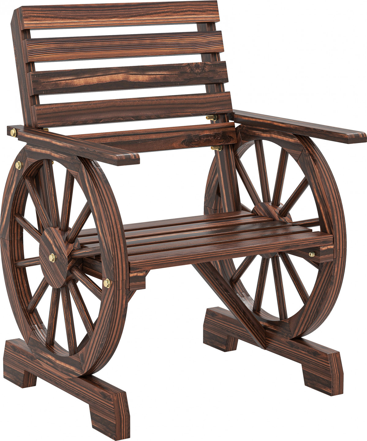 Vneste do svého venkovního prostoru rustikální kouzlo s touto zahradní židlí ve stylu kola od vozu. Je vyrobena z karbonizovaného borovicového a jedlového dřeva, nabízí přírodní kresbu dřeva a pohodlí díky širokému sedáku, šikmému opěradlu a širokým područkám. Zahradní křeslo umožňuje odtok dešťové vody, takže zůstává suché a připravené na chvíle odpočinku.