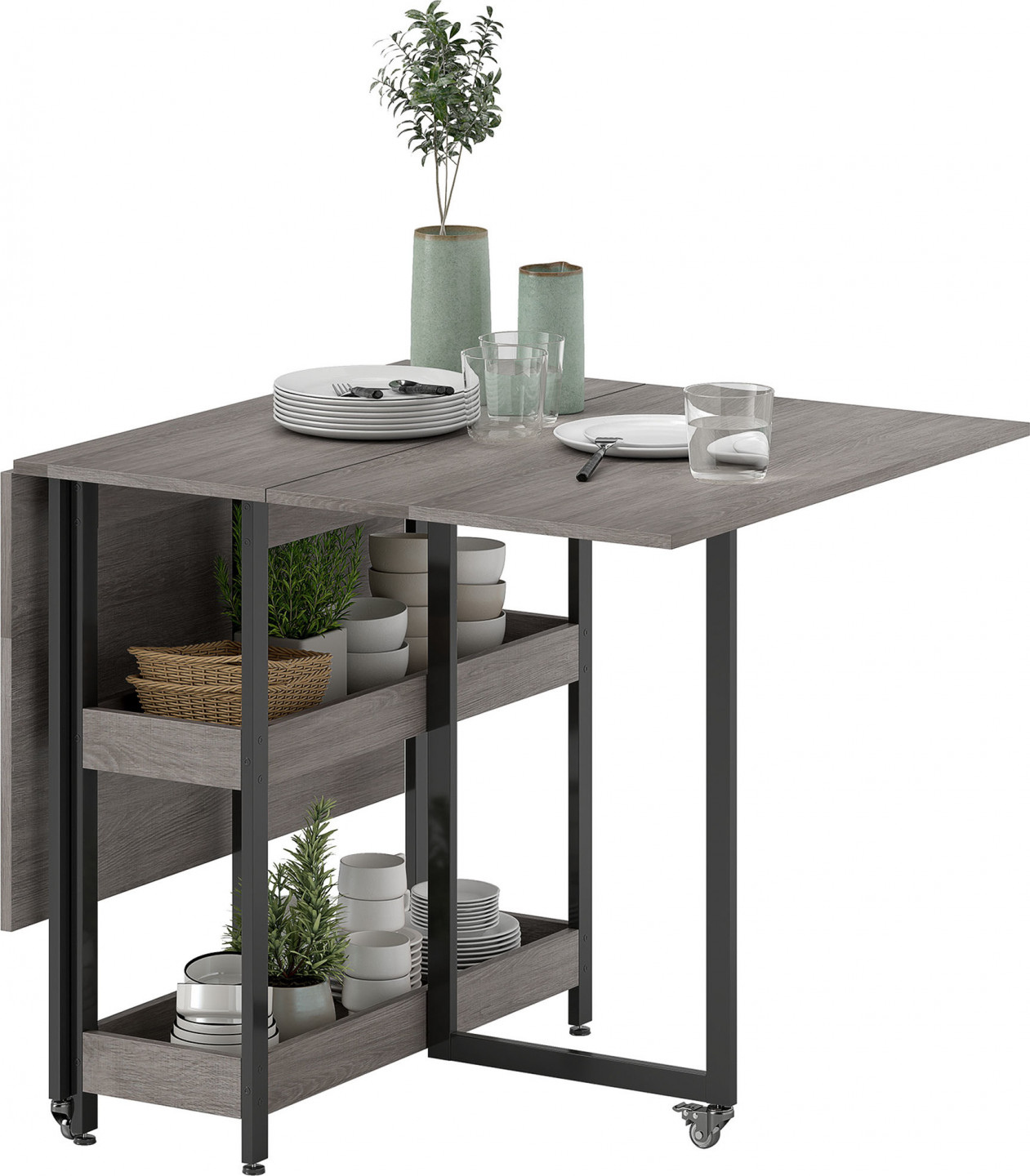 Hledáte univerzální jídelní stůl, který se přizpůsobí vašemu životnímu stylu? Pak je pro vás tento rozkládací stůl ideální: je ideální pro malé prostory a nabízí místo až pro čtyři osoby. Dvě rozkládací desky jídelního stolu umožňují flexibilní použití a otevřené přihrádky bezpečně uchovávají různé předměty. Díky robustnímu rámu a hladce se pohybujícím kolečkům s brzdami jej lze bez námahy složit a bezpečně vytáhnout.