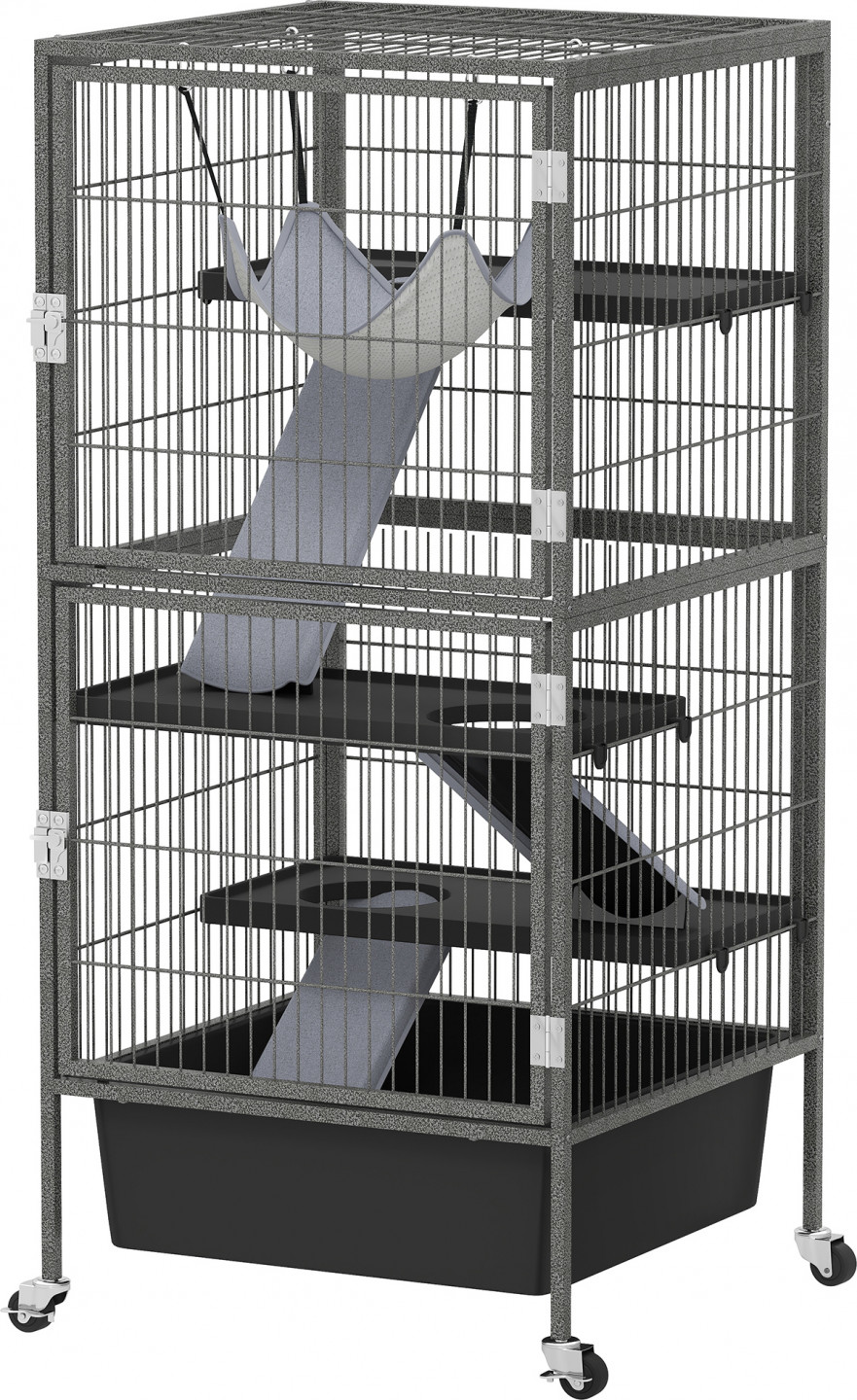 Zažijte pohodlí prostorného obytného prostoru se čtyřpatrovou klecí pro králíky a malá zvířata. Je vybavena třemi útulnými plošinami a rampami s ochrannými kryty pro bezpečný pohyb. Dvoje velká dvířka a vyjímatelná zásuvka usnadňují čištění a přístup do klece pro fretky a králíky. Rozkošný a bezpečný domov pro vaše malé chlupaté kamarády!