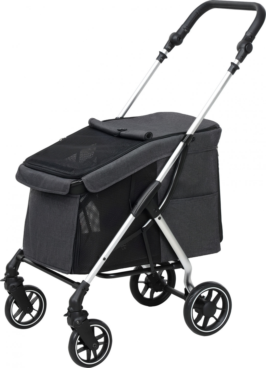- Skládací konstrukce kočárku pro psy usnadňuje skladování a přepravu