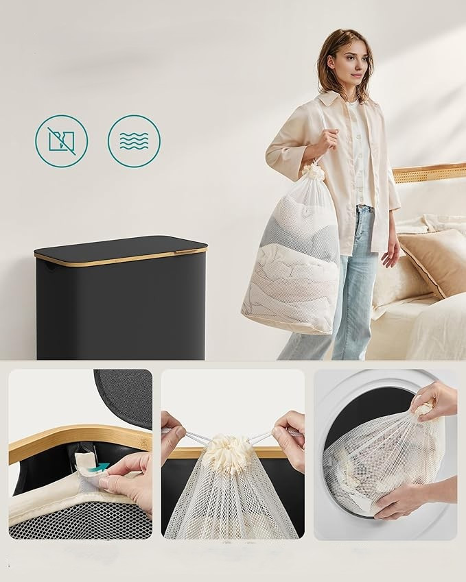 Koš na prádlo je vybaven víkem, které nejen že zadržuje prach, ale také chrání soukromí tím, že skrývá nepořádek. Logo z umělé kůže na víku slouží jako rukojeť pro snadné otevírání a dodává punc elegance