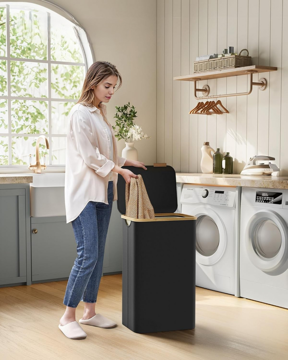Koš na prádlo je vybaven víkem, které nejen že zadržuje prach, ale také chrání soukromí tím, že skrývá nepořádek. Logo z umělé kůže na víku slouží jako rukojeť pro snadné otevírání a dodává punc elegance