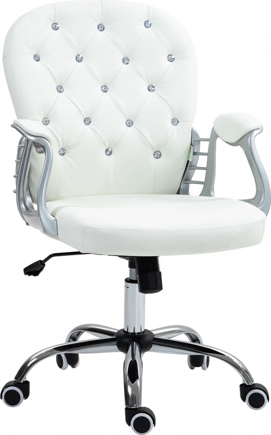 Objevte ideálního společníka pro svou domácí kancelář: naše moderní kancelářská židle kombinuje stylový design s prvotřídním pohodlím. Středně vysoký opěrák a měkký potah ve vzhledu umělé kůže, zdobený dekorativním krystalem a prošíváním knoflíků, nabízejí optimální pohodlí při sezení. Robustní pozinkované nohy zaručují stabilitu a volný pohyb. Tato všestranná kancelářská židle se bez problémů začlení do jakéhokoli prostředí - ať už jde o ložnici, obývací pokoj nebo kancelář.