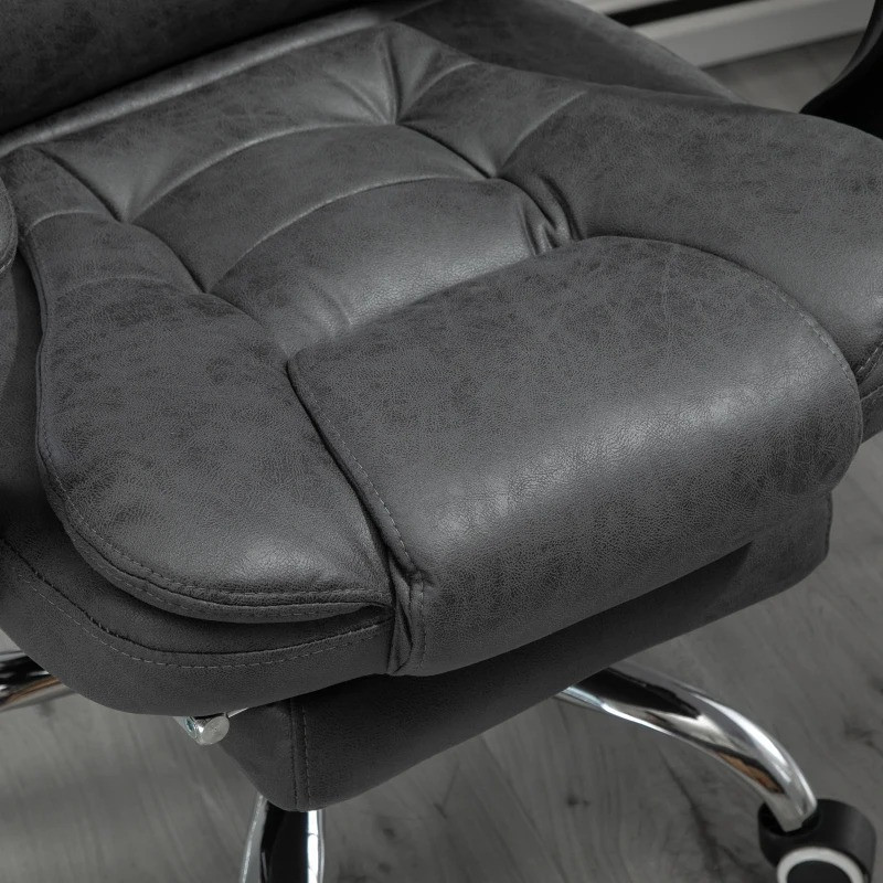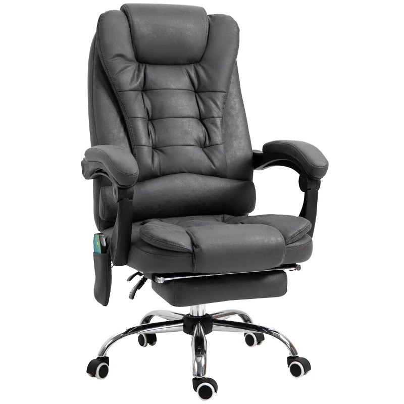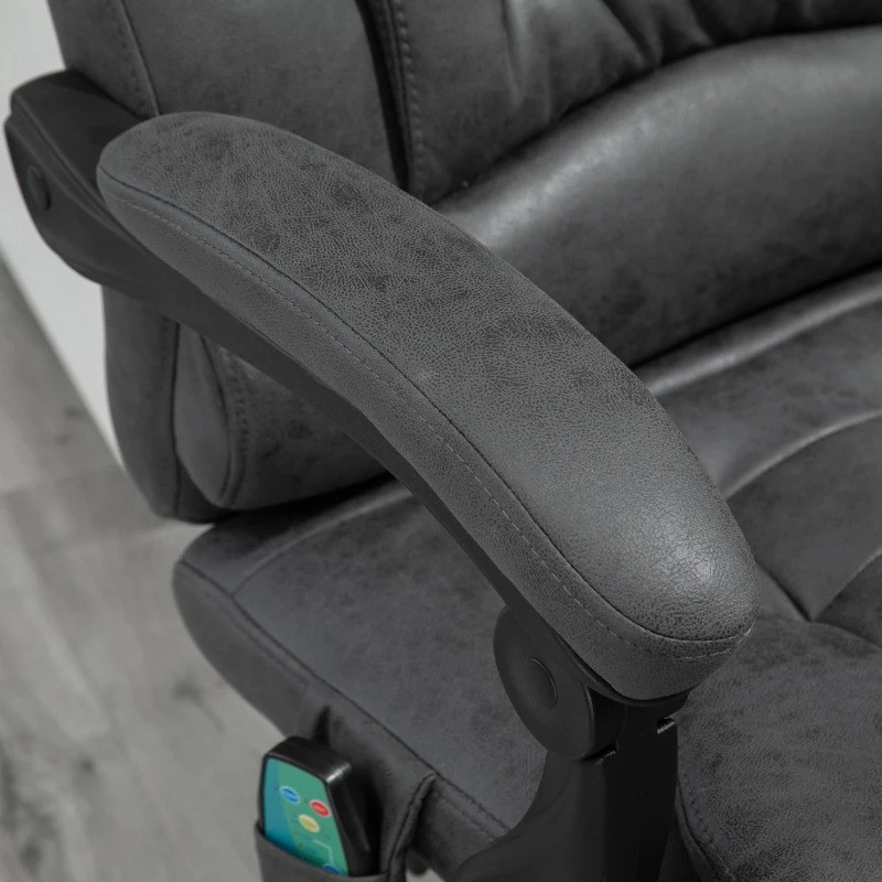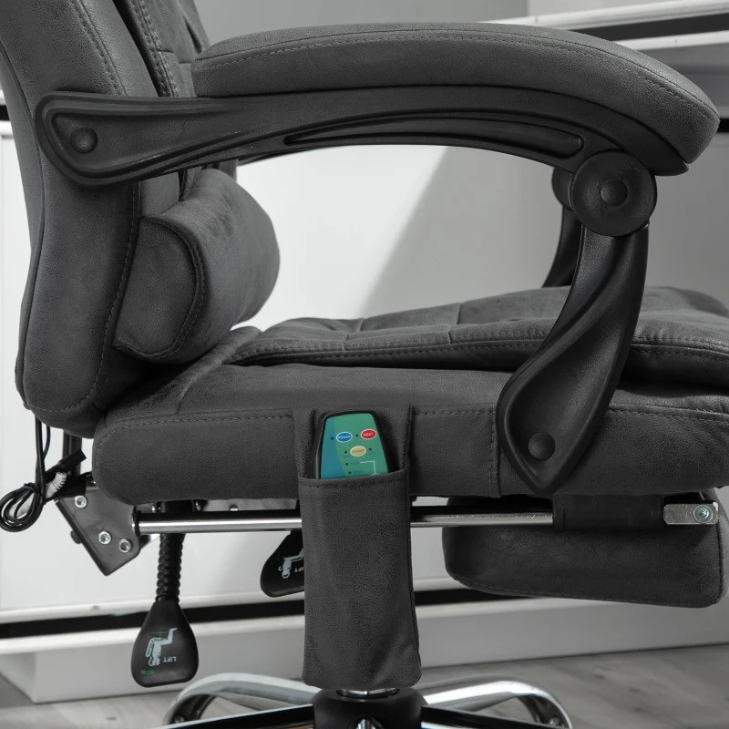Užijte si práci i relaxaci s tímto masážním kancelářským křeslem. Díky elegantnímu čalounění z mikrovlákna nabízí židle pohodlí i styl. Šest vyhřívaných masážních bodů, čtyři v oblasti zad a dva v oblasti sedadla, lze aktivovat dálkovým ovládáním. Velkorysý sedák, vysoký opěrák a područky židle k PC poskytují optimální pohodlí. Opěradlo lze naklonit až do úhlu 135° a manuální podnožka usnadňuje zvedání nohou.