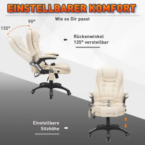 Dlhé sedenie je u väčšiny ľudí samozrejmosťou. Aby sme dokázali tieto výzvy dokonale zvládnuť, máme k dispozícii praktickú výkonnú stoličku s masážnou funkciou. Upokojujúca vibračná masáž povzbudí vaše telo pri práci. Vďaka integrovanému kúreniu sa vaše svaly uvoľňujú o niečo rýchlejšie. Kancelárska stolička je vyrobená z vysoko kvalitnej umelej kože. To nielenže vyzerá elegantne, ale je aj ľahké sa o ňu starať. Stolička je ergonomicky tvarovaná a výškovo nastaviteľná.