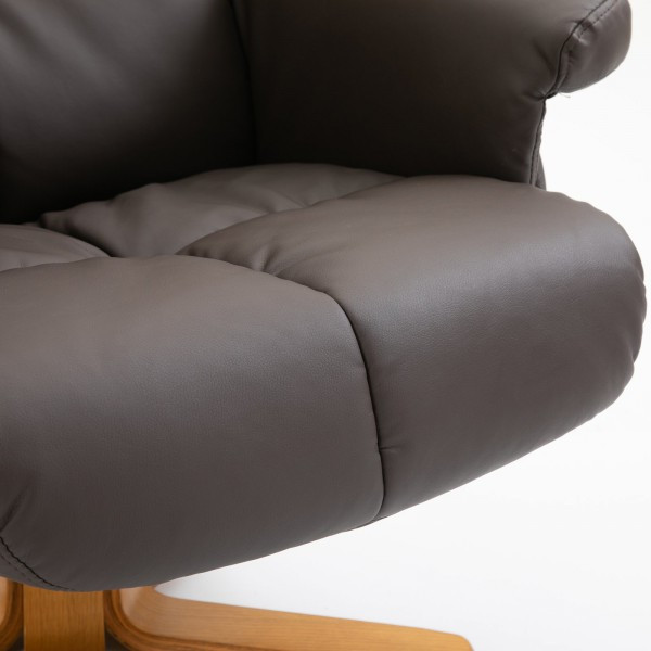 Relaxačné kreslo je čalúnené mäkkou umelou kožou s ozdobným prešívaním a robustnou drevenou základňou. V interiéri zapôsobí elegantným dojmom. Polohovací mechanizmus umožňuje nastaviť kreslo do úplne rovnej polohy, takže si na ňom môžete aj zdriemnuť.