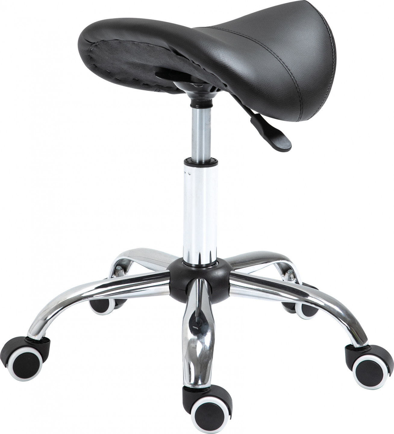 Tato ergonomická stolička ve tvaru sedla díky speciálnímu tvaru sedáku automaticky zajišťuje vzpřímené sezení, které snižuje tlak na páteř. Stolička je vybavena pohodlnou plynovou pružinou, je výškově nastavitelná a lze ji otáčet. Čalouněný sedák je vyroben z hladké, snadno udržovatelné koženky. Křížová základna stoličky je vybavena pěti robustními nylonovými kolečky. Praktická stolička je ideální pro každodenní použití v domácnosti, v každém kadeřnictví, kosmetickém salonu nebo kanceláři.