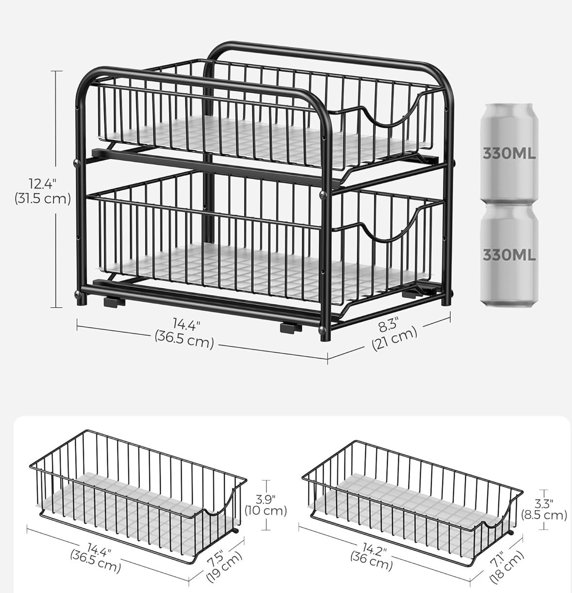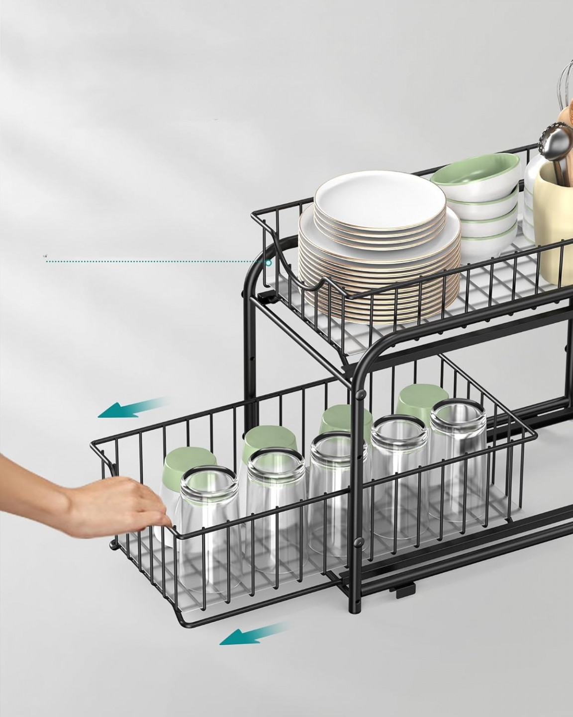 Tento kuchyňský organizér je ideálním řešením pro uspořádání vašich kuchyňských potřeb, kořenek, talířů, příborů či drobného nádobí. S moderním černým designem se hodí do každé kuchyně, ať už máte rustikální, minimalistický nebo industriální styl. Díky dvěma patrovým policím vám poskytne dostatek úložného prostoru, a zároveň šetří místo na pracovní ploše.