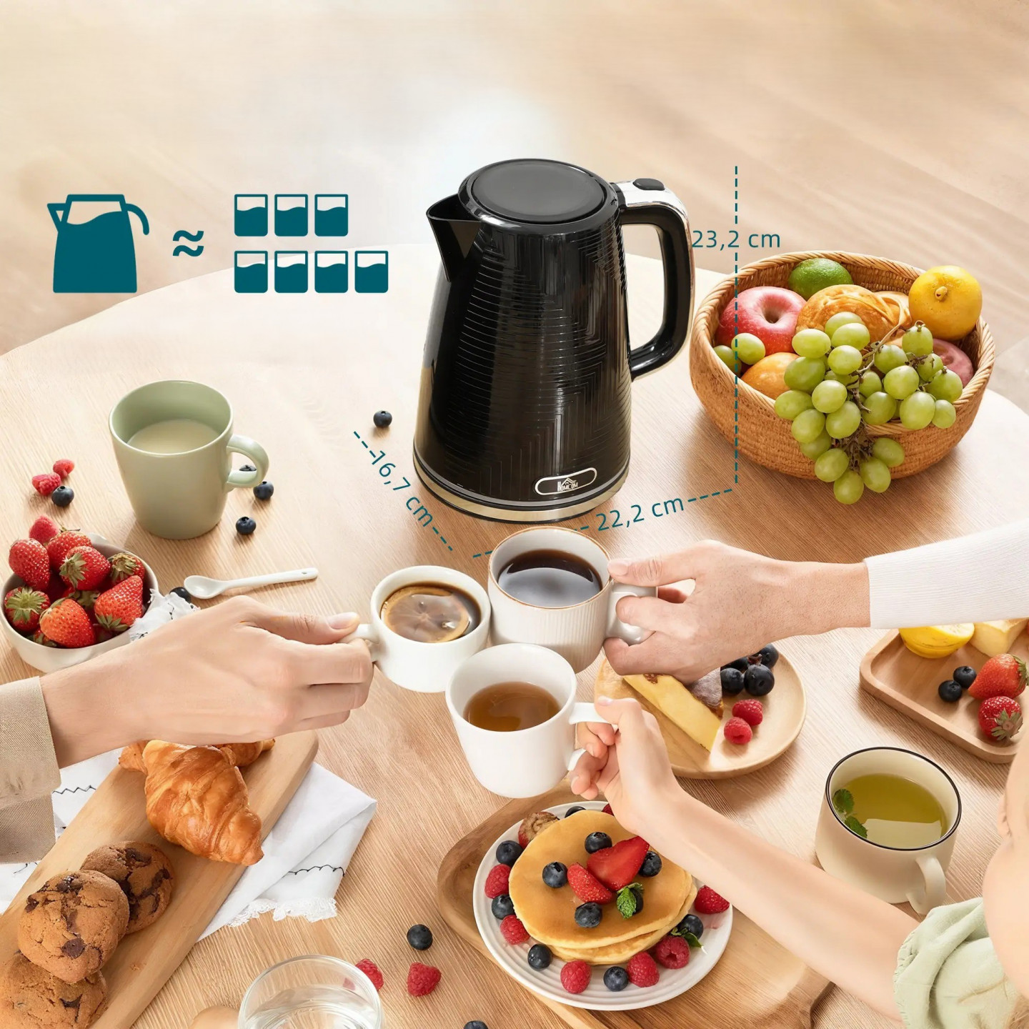 Rychlovarná konvice o objemu 1,7 litru s termostatem je určena pro vytížené rodiny nebo domácí kanceláře a zajišťuje rychlé a přesné vaření. Díky funkcím, jako je automatické zastavení, ochrana proti vyvaření a přehřátí, zaručuje maximální bezpečnost. Topinkovač snídaňové sady se dvěma otvory má 7 nastavení pro vždy dokonale opečený chléb, ať už mražený nebo čerstvý.
