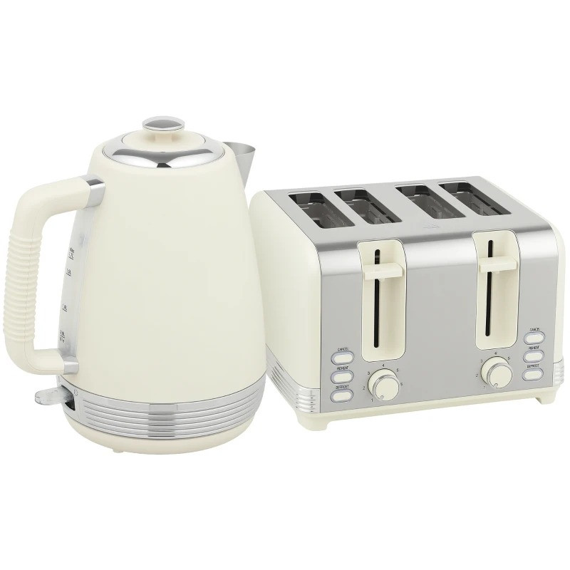 - Snídaňová sada obsahuje rychlovarnou konvici a čtyřplátkový topinkovač v jednotném stylu.