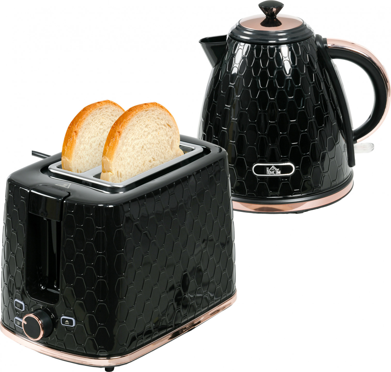 - Konvice o objemu 1,7 l a odpovídající topinkovač na dva plátky. Stylový vzor včelí plástve