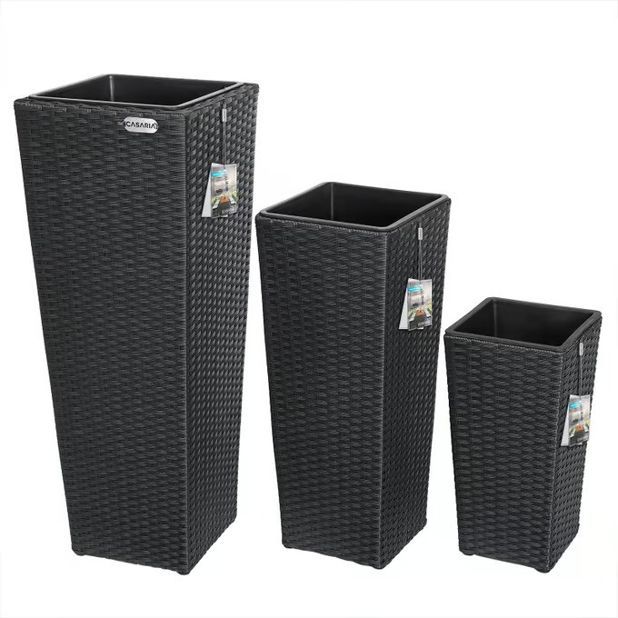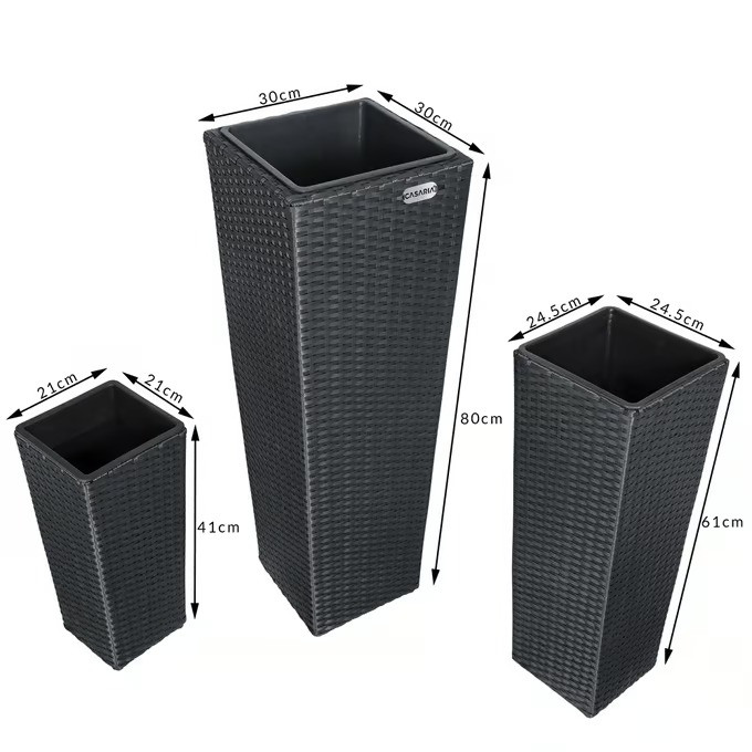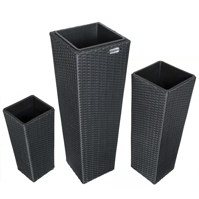 Oživte svůj interiér nebo zahradu s sadou 3 květináčů z polyratanu v elegantní černé barvě. Tyto květináče kombinují moderní design, odolný materiál a praktickou velikost, takže jsou ideální pro různé rostliny a květiny.