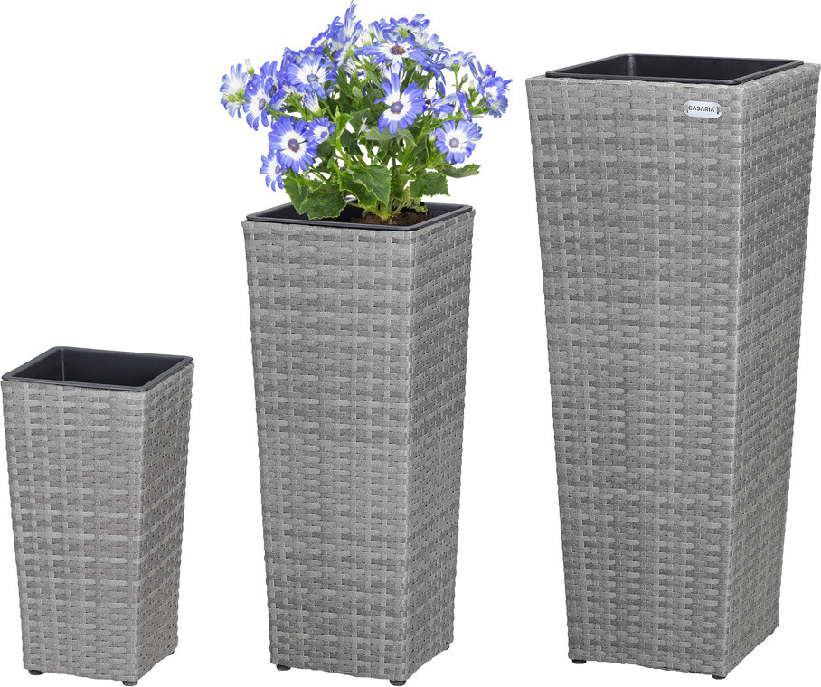 Sada tří květináčů je ideální pro výsadbu na zahradě, na balkoně, v bytě nebo v zimní zahradě. Stylové květináče vyrobené z ručně tkaného polyratanu jsou skutečným poutačem. Sadu můžete použít venku i uvnitř. Polyratan je velmi stabilní, rovnoměrně navinuté syntetické vlákno speciálně vyvinuté pro zahradní nábytek. Je odolné vůči povětrnostním vlivům, UV záření, nečistotám a snadno se čistí. Vnitřní květináče lze snadno vyjmout z rámu. Velký květináč má integrovaný odtok vody, který lze pohodlně otevírat a zavírat pomocí vestavěného zámku. Abyste zabránili zamokření malých květináčů, stačí vyvrtat otvor na určeném místě ve spodní části.