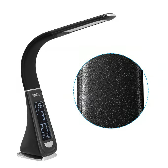 Multifunkční stolní lampa v koženém vzhledu s budíkem, kalendářem, hodinami a teploměrem! Vysoce kvalitní displej stolní lampy zobrazuje čas, kalendář, teplotu a integrovaný budík. Díky tmavému displeji bez odlesků můžete lampu použít i jako noční lampičku, aniž byste byli v noci oslňováni displejem. Stolní lampa je k dispozici také ve stylovém koženém vzhledu . Multifunkční lampa má tři úrovně jasu (30 %, 70 % a 100 %) a lze ji přizpůsobit vašim potřebám. Hlavu kancelářské lampy lze otáčet a naklánět do různých směrů , což poskytuje perfektní světlo pro každou situaci . Kvůli moderní LED technologii má noční lampa dlouhou životnost a nízkou spotřebu energie . Pogumovaná základna lampy zajišťuje bezpečné, protiskluzové držení a zároveň zabraňuje poškrábání povrchu stolu. Přídavná knoflíková baterie (součástí balení) ukládá nastavení displeje . Nastavení není nutné znovu zadávat, pokud je lampa odpojena od sítě.