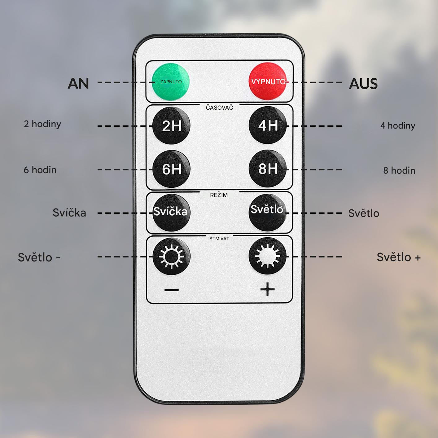 - Vlastnosti: Efekt blikající svíčky, nepřetržité světlo, 4stupňové stmívání, časovač