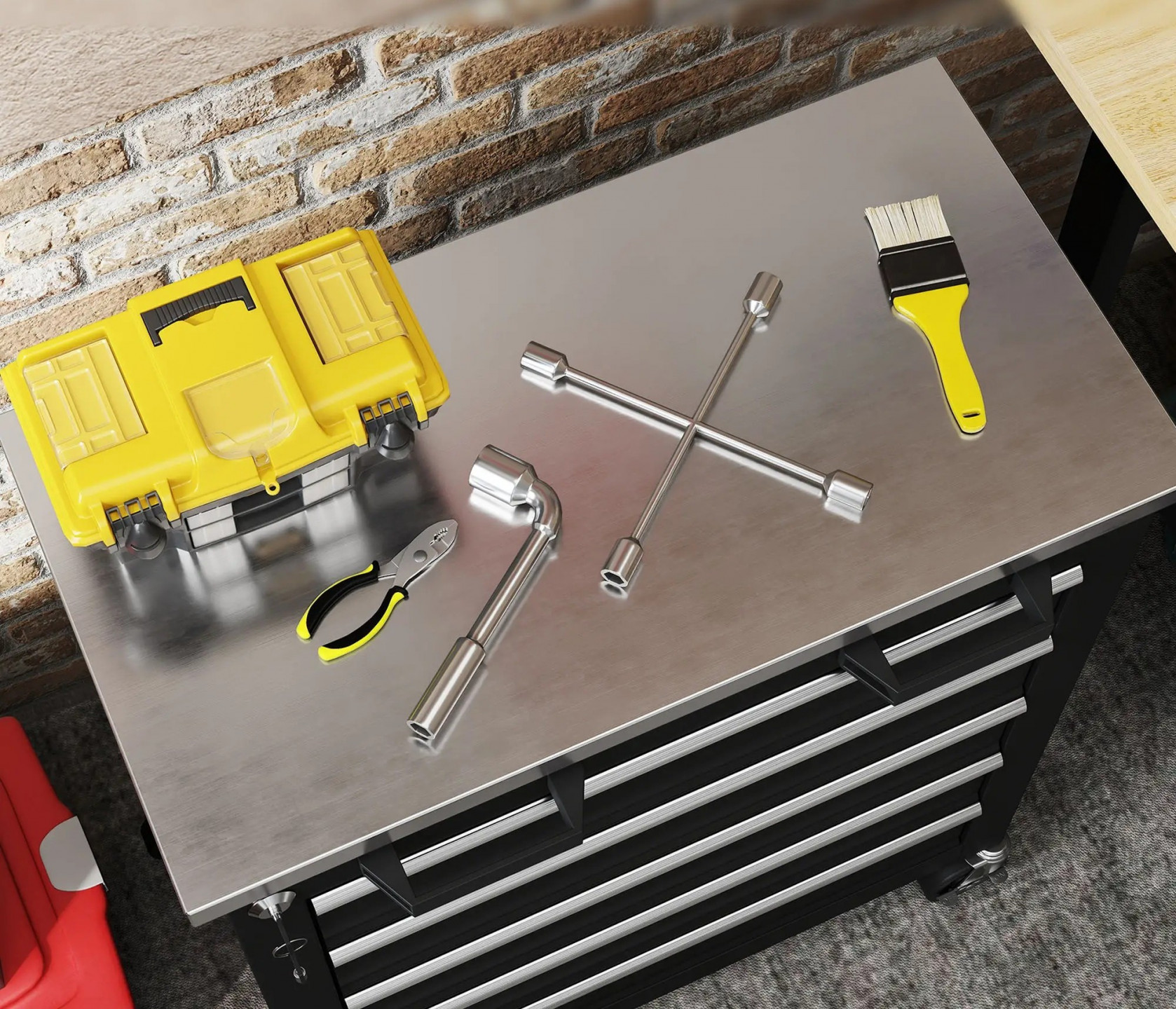 Máte už dost nepořádku v dílně, který vás zpomaluje? Vozík na nářadí s nepořádkem skoncuje: pět hlubokých zásuvek potažených materiálem EVA poskytuje organizovaný úložný prostor, zatímco vyztužený ocelový povrch slouží jako pevná pracovní plocha. Tento robustní vozík na nářadí je vyroben z oceli s práškovým nástřikem a je vybaven bezpečnostním zámkem, díky čemuž bude vaše nářadí uspořádané, bezpečné a snadno dostupné - pro větší efektivitu a klid při práci.