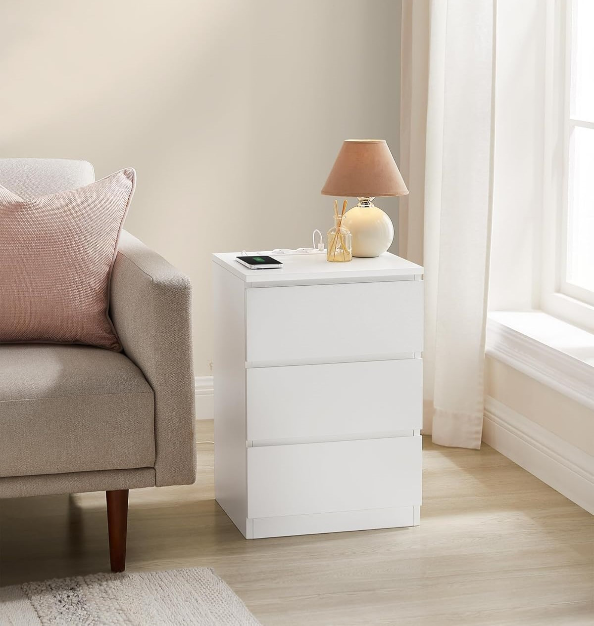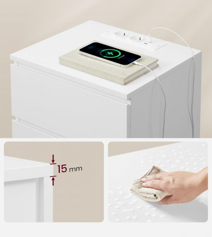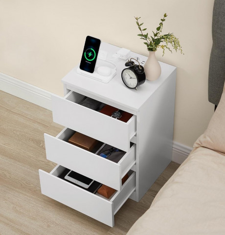 Ať už si chcete schovat čtení před spaním nebo mít po ruce brýle, tento noční stolek vám díky prostorné desce a 3 snadno otevíratelným zásuvkám se zkosenými hranami poskytne dostatek prostoru.