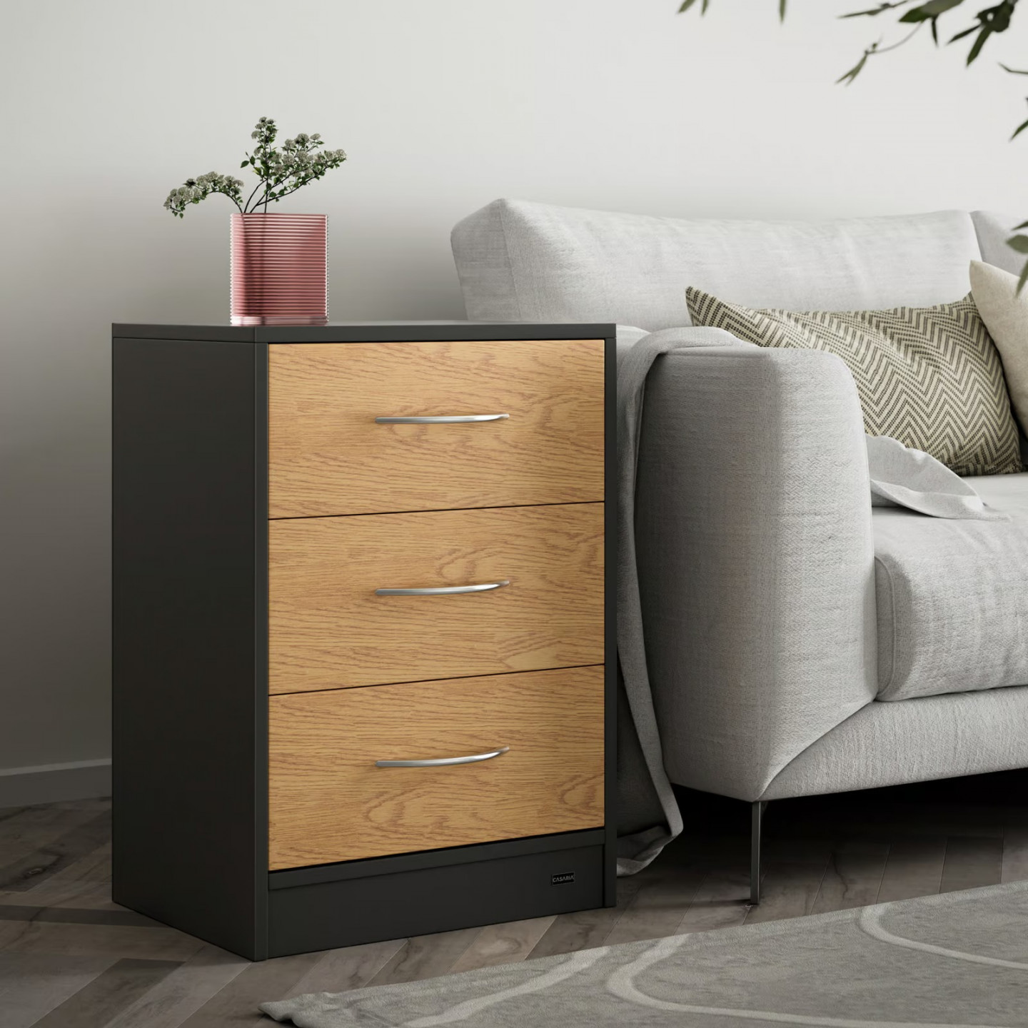 Elegantní sada dvou nočních stolků Eloise kombinuje přírodní dřevo s moderní šedou barvou, díky čemuž skvěle zapadne do každé ložnice. Stolek o rozměrech 54 × 39 × 28 cm nabízí praktický úložný prostor, který vám pomůže udržet pořádek a mít vše potřebné vždy po ruce. Kombinace dřeva a šedé barvy působí moderně, nadčasově a snadno se ladí s různými typy interiérů. Tato sada dvou stolků je perfektní volbou pro ty, kteří hledají praktické a zároveň stylové doplnění ložnice.