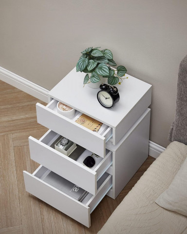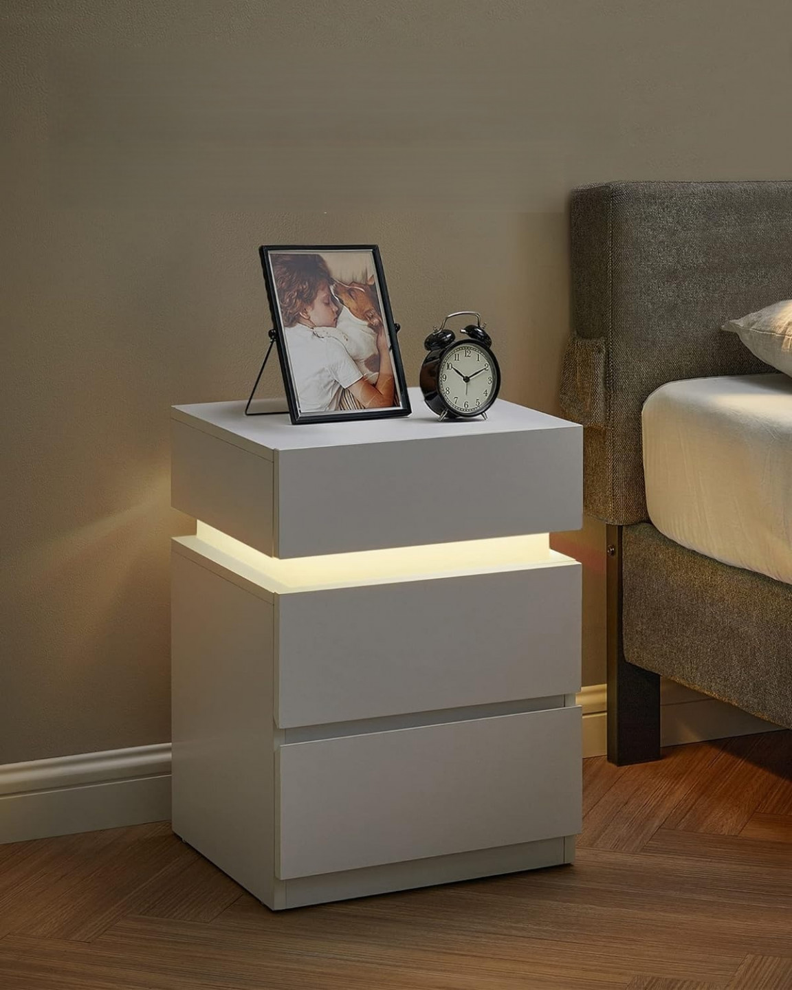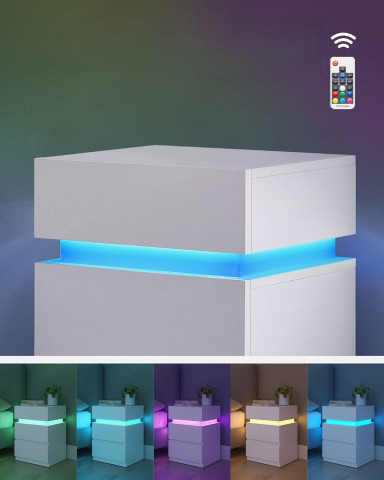 Tento malý noční stolek je vyrobený z 15mm dřevotřísky, takže je stabilní a robustní. Díky 3 prostorným zásuvkám a velkému odkládacímu stolku lze noční stolek umístit vedle postele a ukládat do něj noviny. Budík a fotorámečky najdou na odkládacím stolku své ideální místo. LED světla zabudovaná v nočním stolku se dodávají v 25 barvách, 6 úrovních jasu, 10 režimech a 6 blikajících frekvencích. Díky dálkovému ovladači si je můžete nastavit a vytvořit tak různou atmosféru.