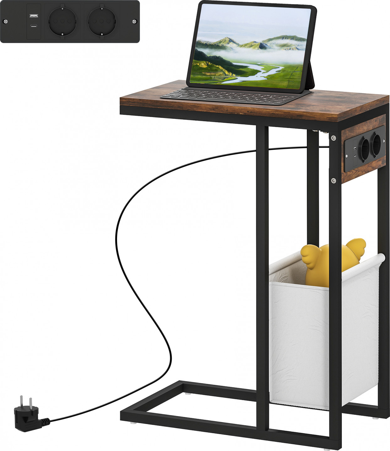 Vyzkoušejte pohodlí našeho postranního stolku se dvěma napájecími konektory, dvěma porty USB a portem USB-C. Jeho zaoblený design s tmavými dekory dřeva a černou ocelí vylepší každou místnost. Velkorysá deska stolku a elegantní látková kapsa pod ní z něj dělají stylový a užitečný doplněk, ať už jako noční stolek, doplňkový stolek nebo vedle pohovky.