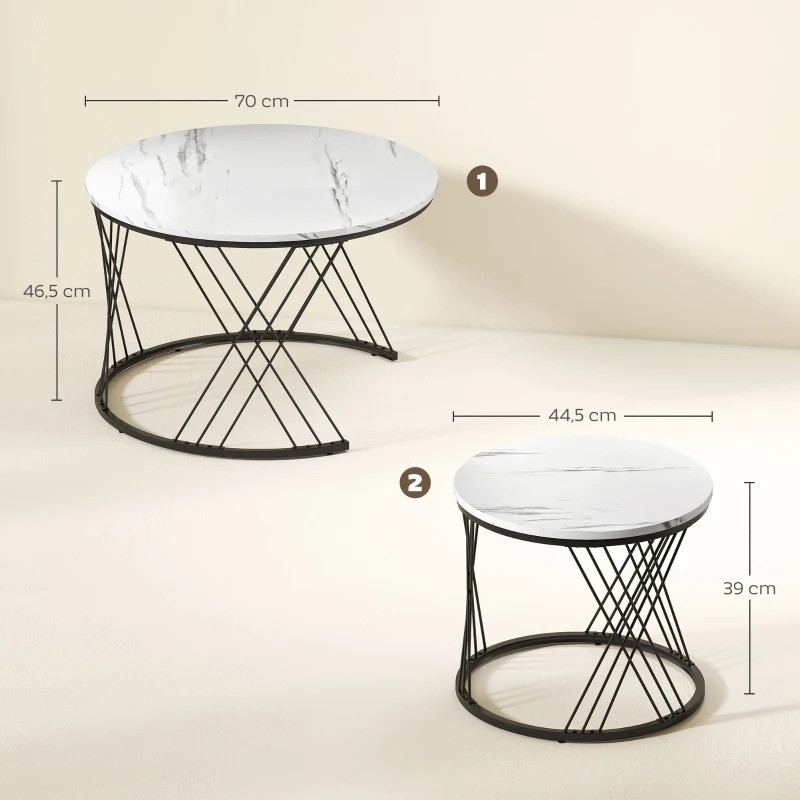 Kulaté stolky v této sadě stolků můžete postavit na sebe, abyste ušetřili místo, nebo je můžete rozložit a používat samostatně, abyste rozšířili jejich funkci. Mramorově vyhlížející desky stolků této sady poskytují eleganci a stabilitu a udržují váš domov příjemný a připravený na všechny příležitosti.