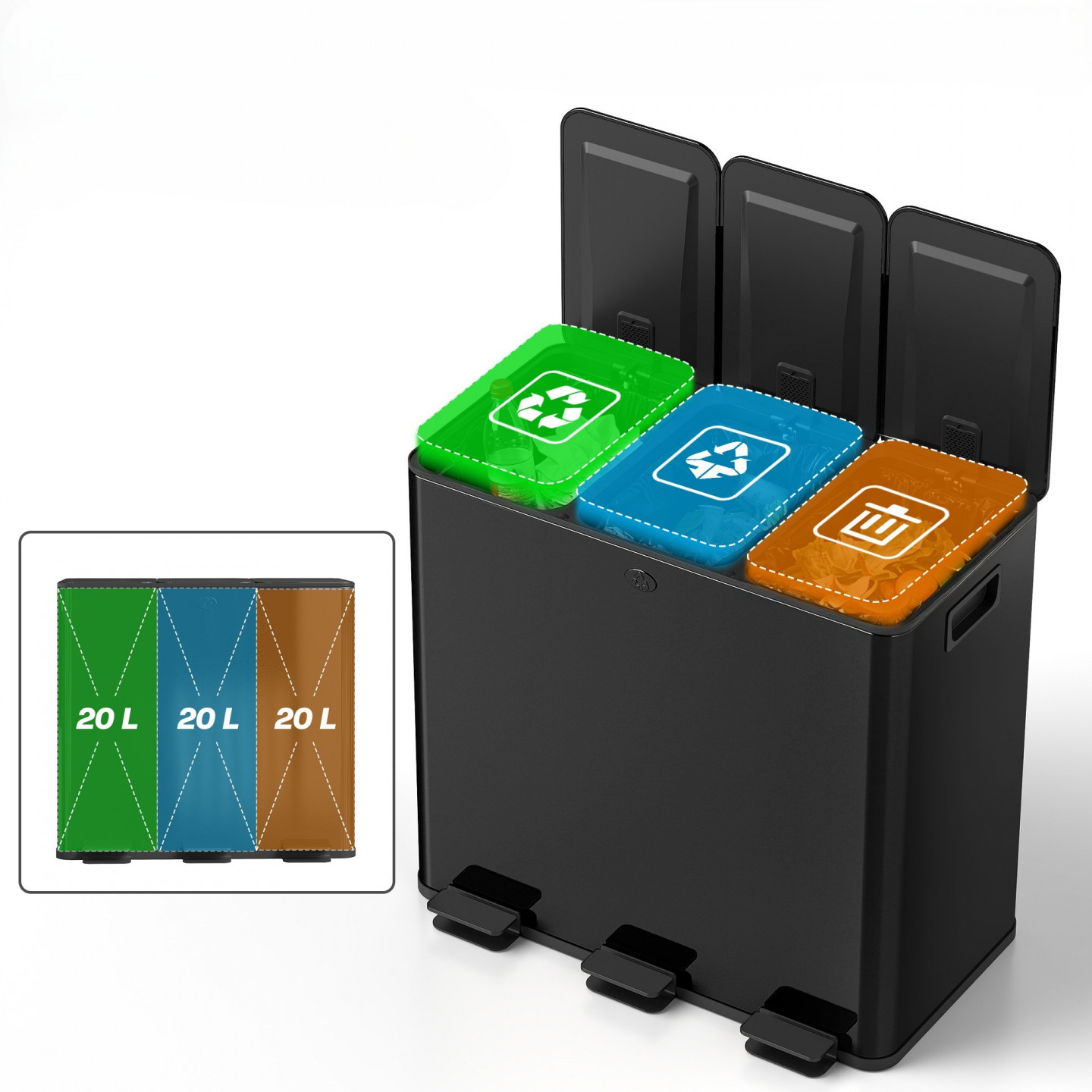 - Tři 20litrové přihrádky kuchyňského koše usnadňují recyklaci a třídění odpadu