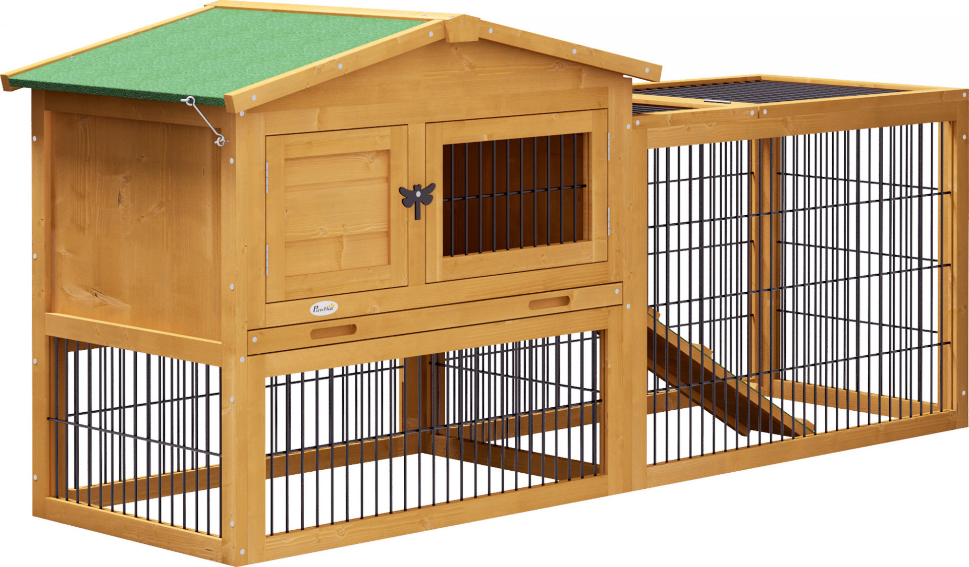 Tato dvoupatrová dřevěná králíkárna s integrovaným výběhem je ideální pro králíka, zakrslého králíka, morče či jiné malé hlodavce. Je vyrobena z masivního dřeva a disponuje robustní kovovou mříží. Díky domku s asfaltovou krytinou nabízí králíkárna bezpečné útočiště při špatném počasí. Součástí králíkárny je rampa a výsuvný šuplík pro snadné čištění.