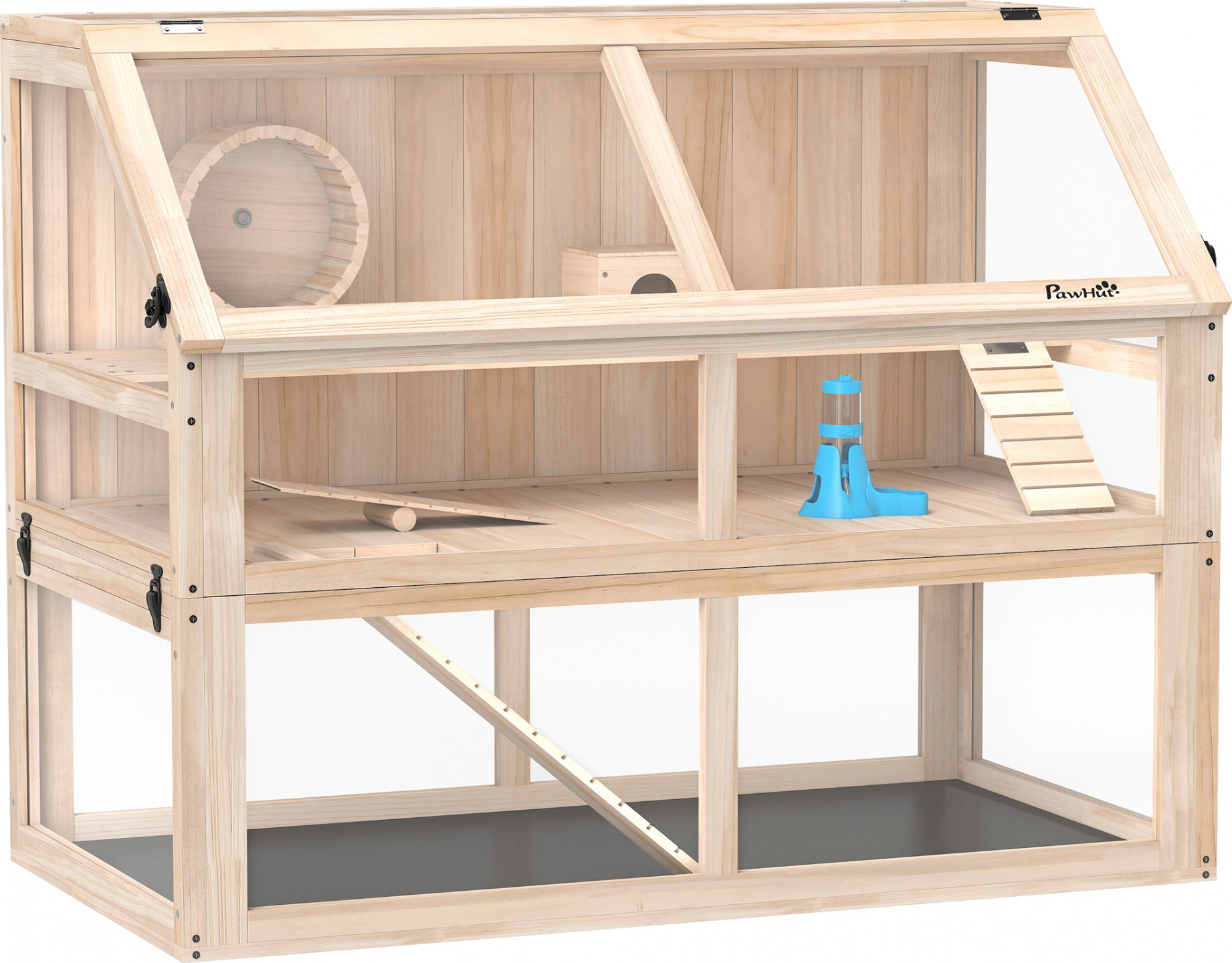 - Průhledné akrylové panely poskytují jasný přehled o aktivitách křečků